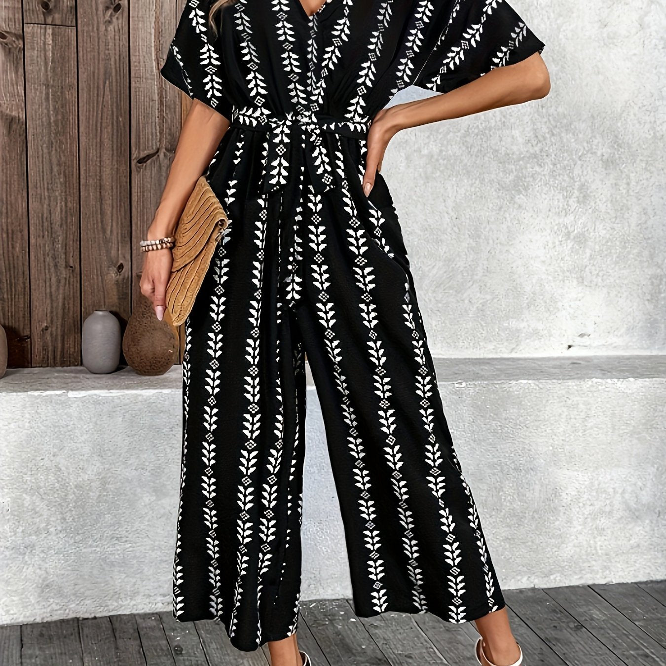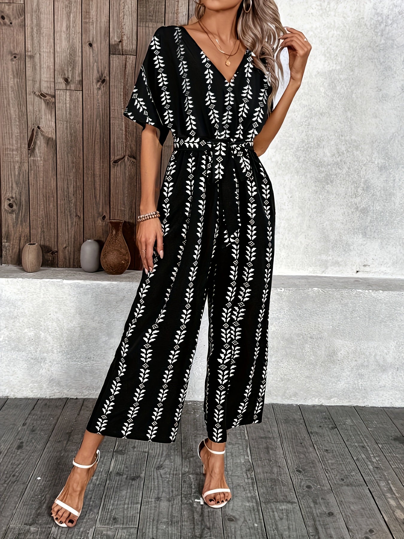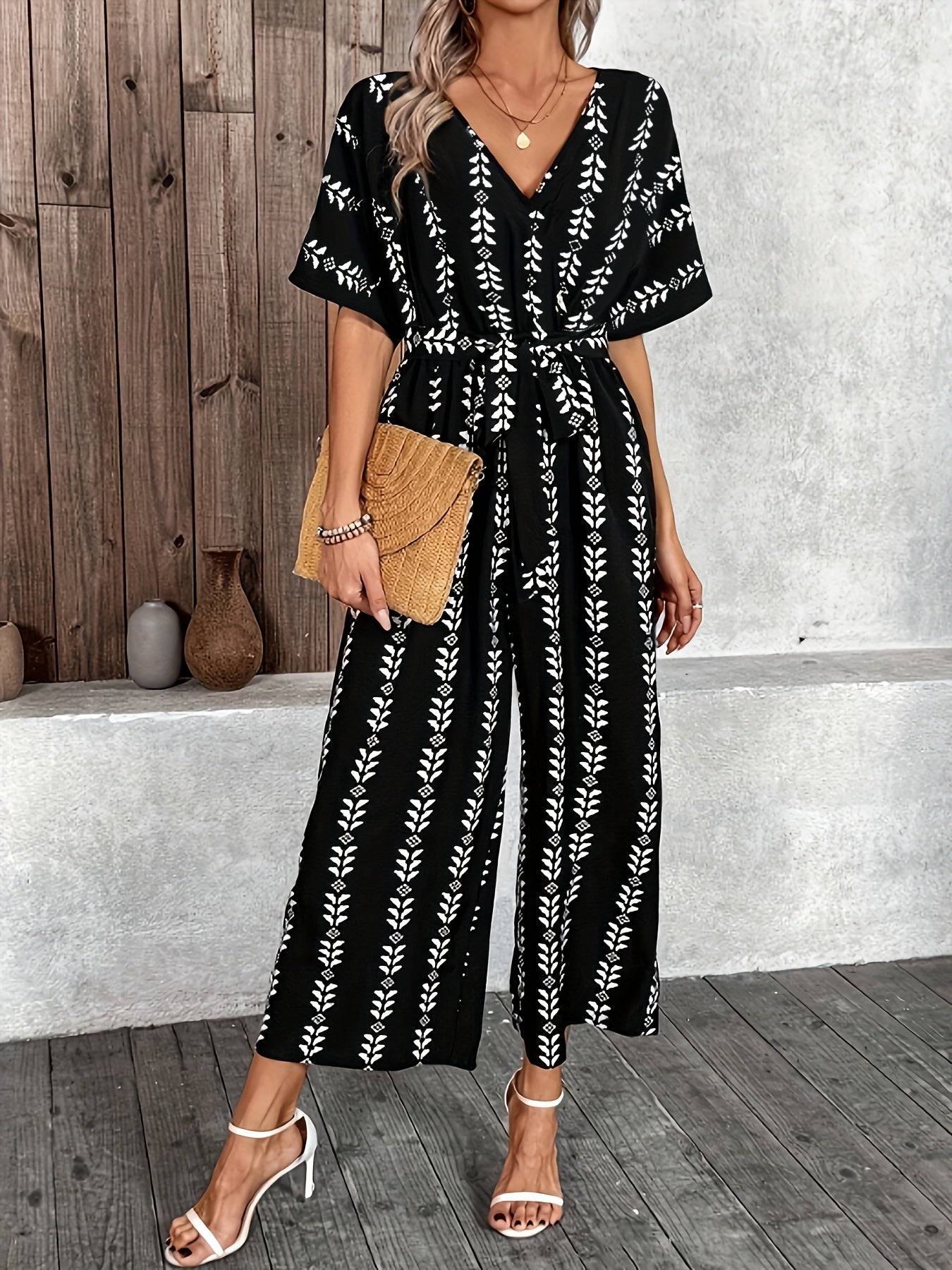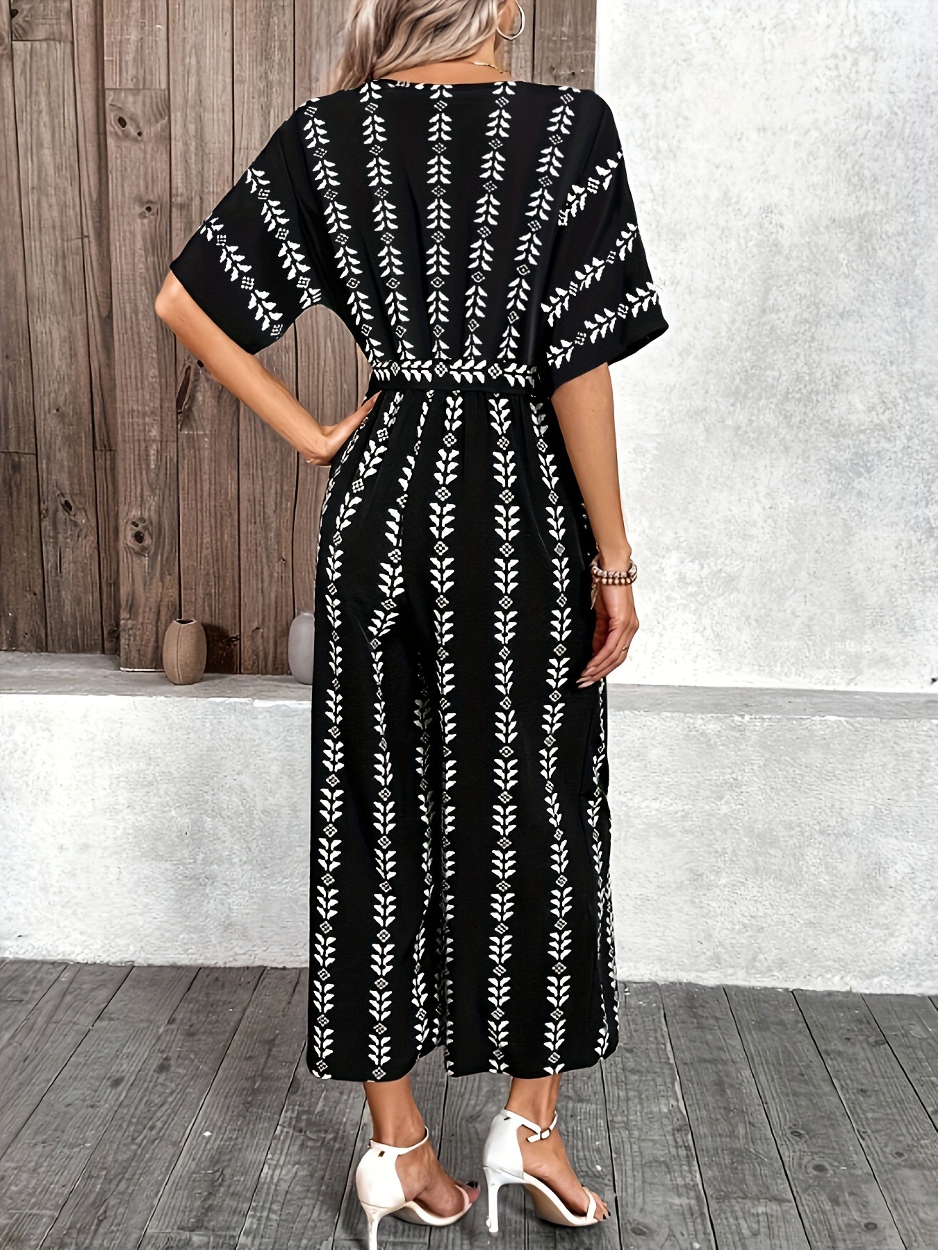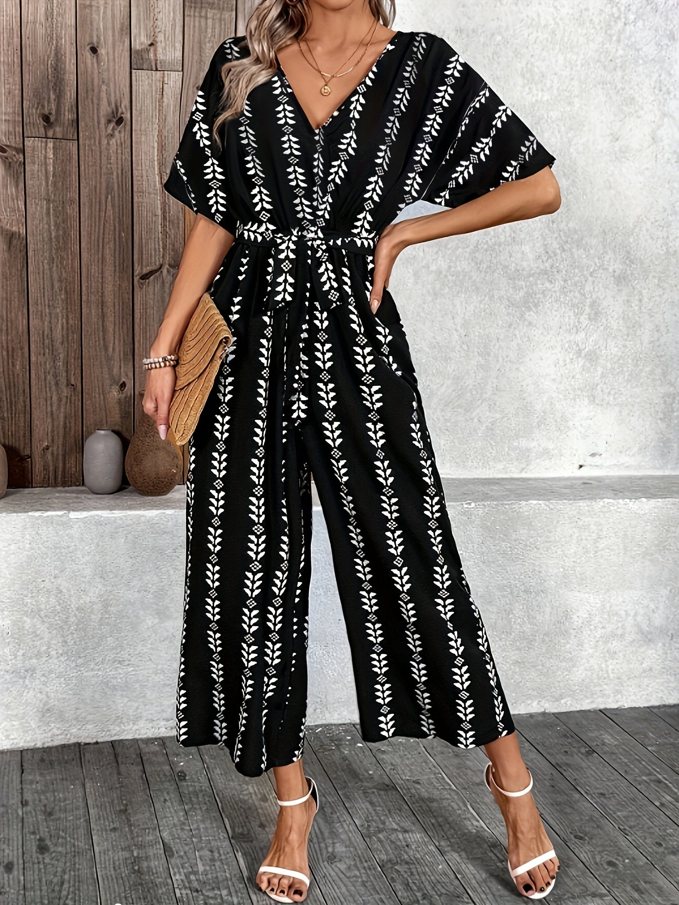 Wygodny kombinezon plus size z losowym nadrukiem geometrycznym i wiązaniem w pasie. Luźny krój zapewnia swobodę, a lekka tkanina sprawia, że jest idealny na każdą porę roku. Świetny wybór na codzienne wyjścia i letnie spotkania w plenerze.