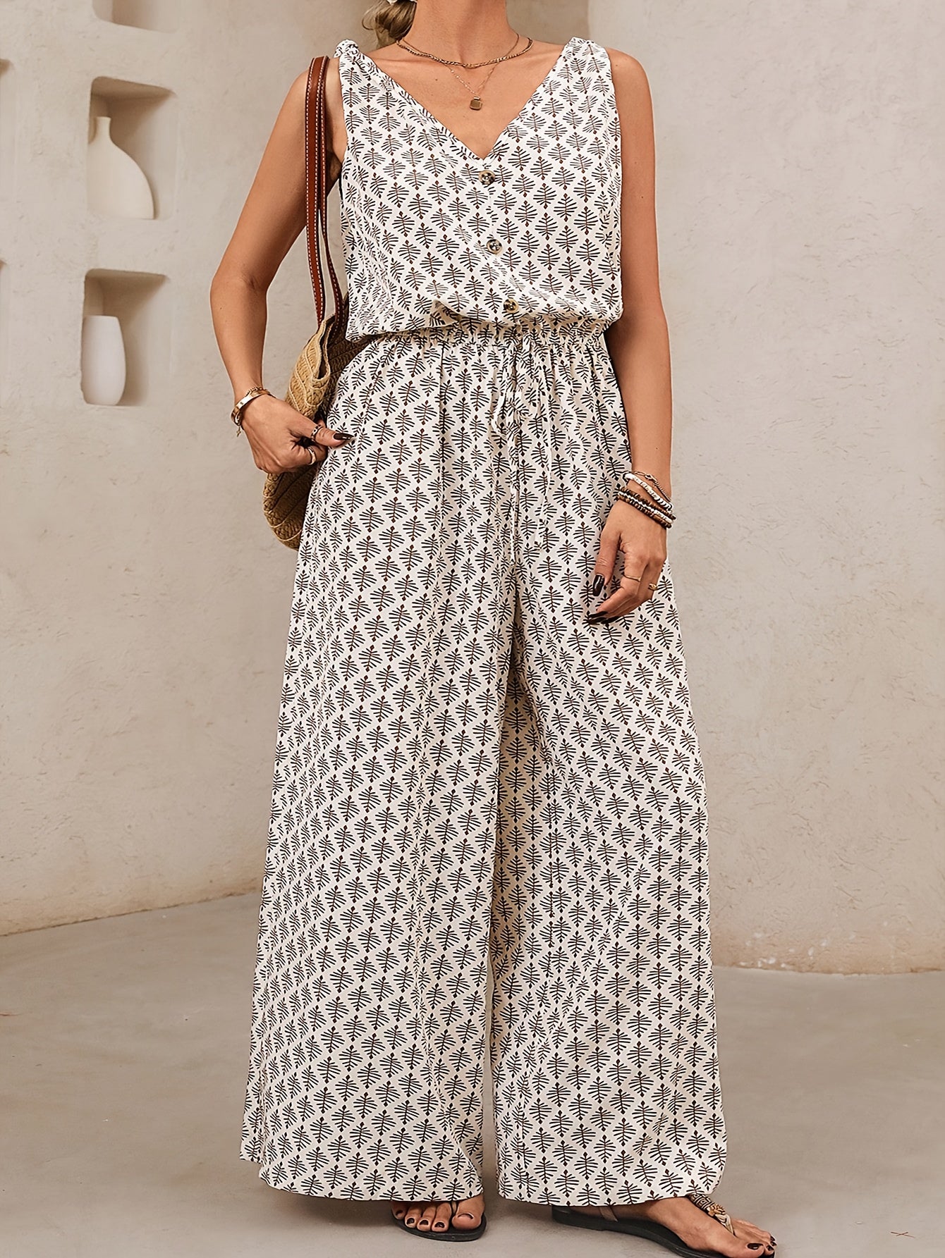 Kombinezon z geometrycznym nadrukiem i dekoltem V, który łączy elegancję z wygodą. Luźne, szerokie nogawki oraz sznurek w pasie zapewniają komfort przez cały dzień. Idealny na wiosenne i letnie stylizacje, zarówno casualowe, jak i wyjściowe.