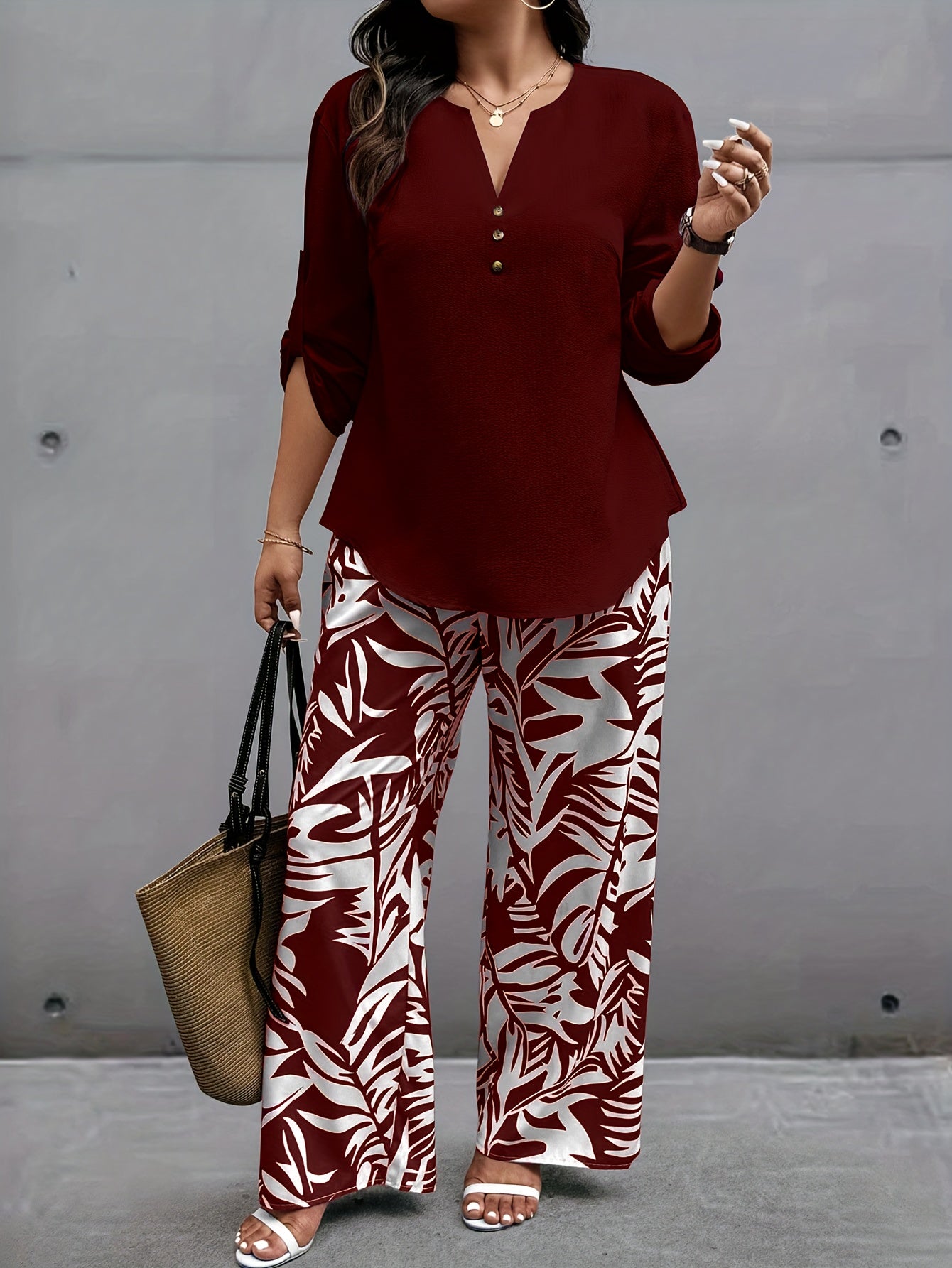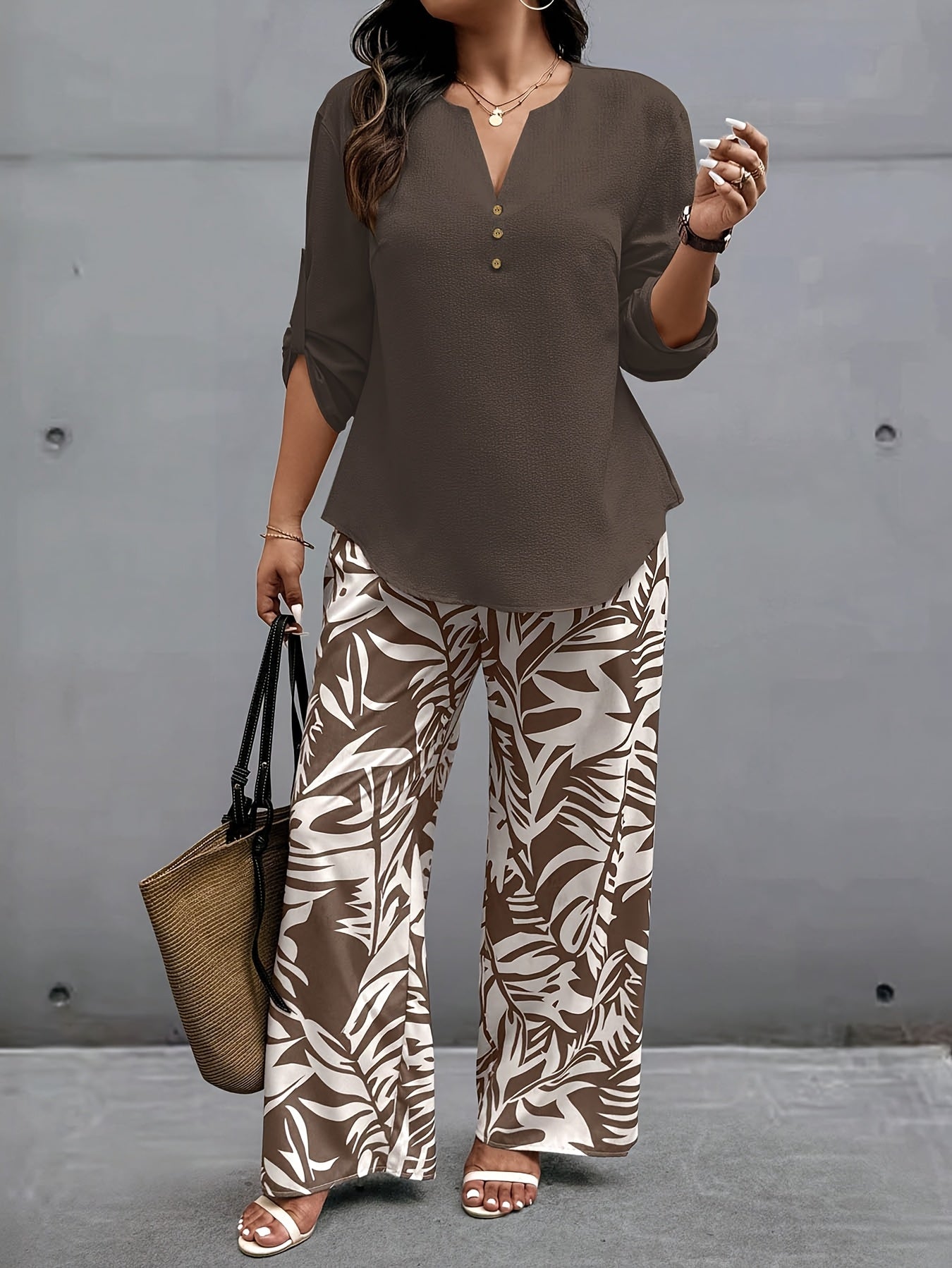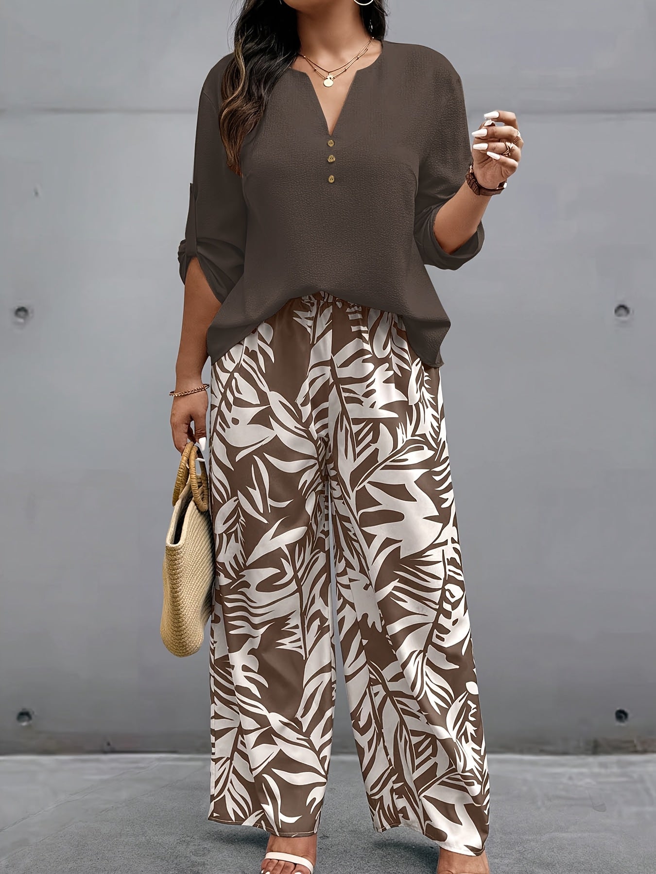 Modny komplet plus size składający się z topu z dekoltem V, zapinanym na guziki i spodni z wysokim stanem w nadruk. Średniej długości rękawy oraz luźny krój zapewniają komfort i styl na lato. Idealny na casualowe wyjścia i wakacje.