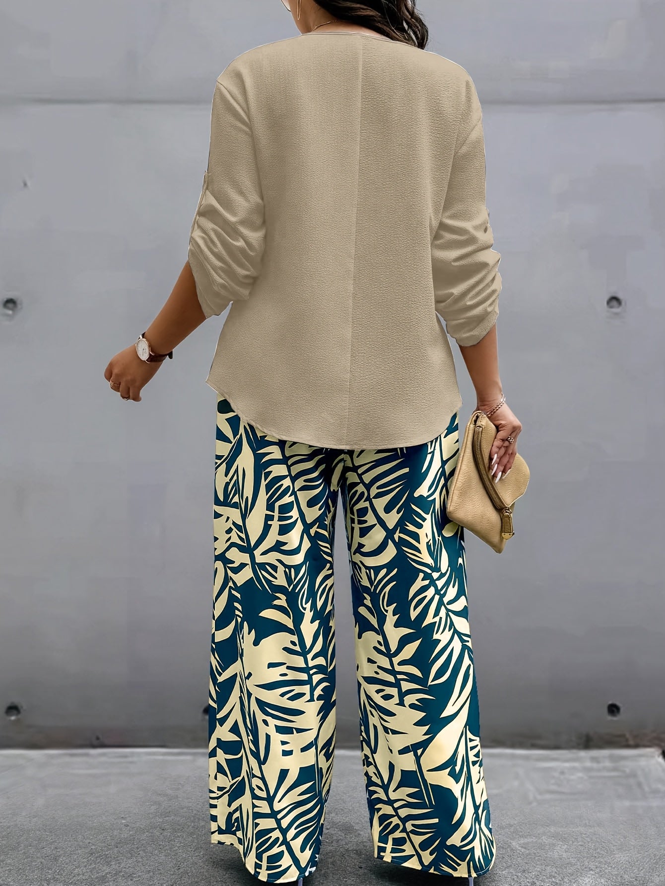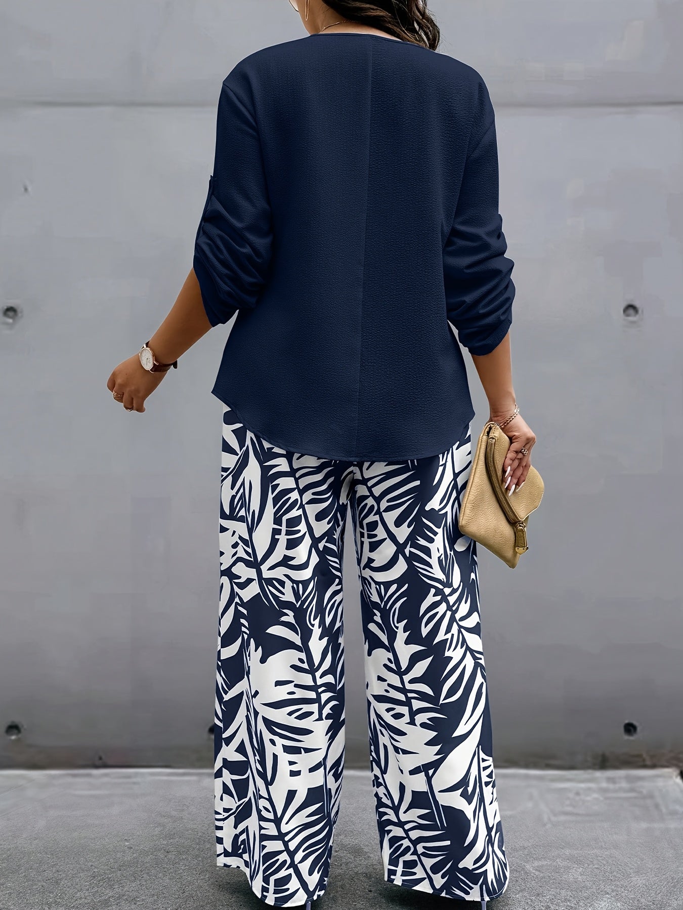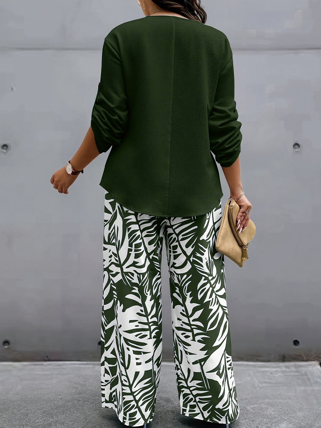 Modny komplet plus size składający się z topu z dekoltem V, zapinanym na guziki i spodni z wysokim stanem w nadruk. Średniej długości rękawy oraz luźny krój zapewniają komfort i styl na lato. Idealny na casualowe wyjścia i wakacje.