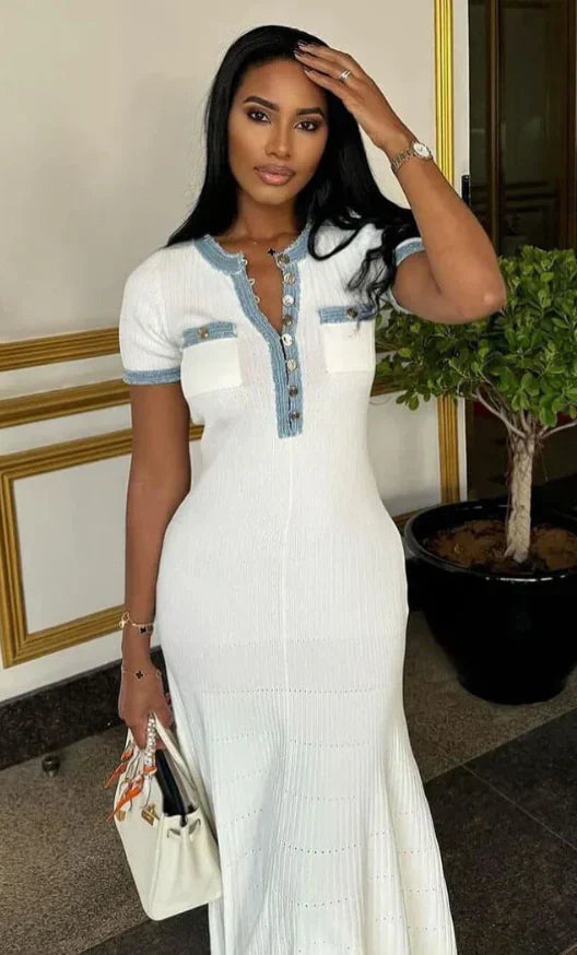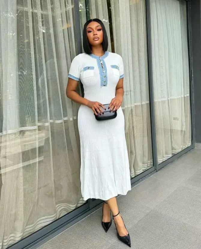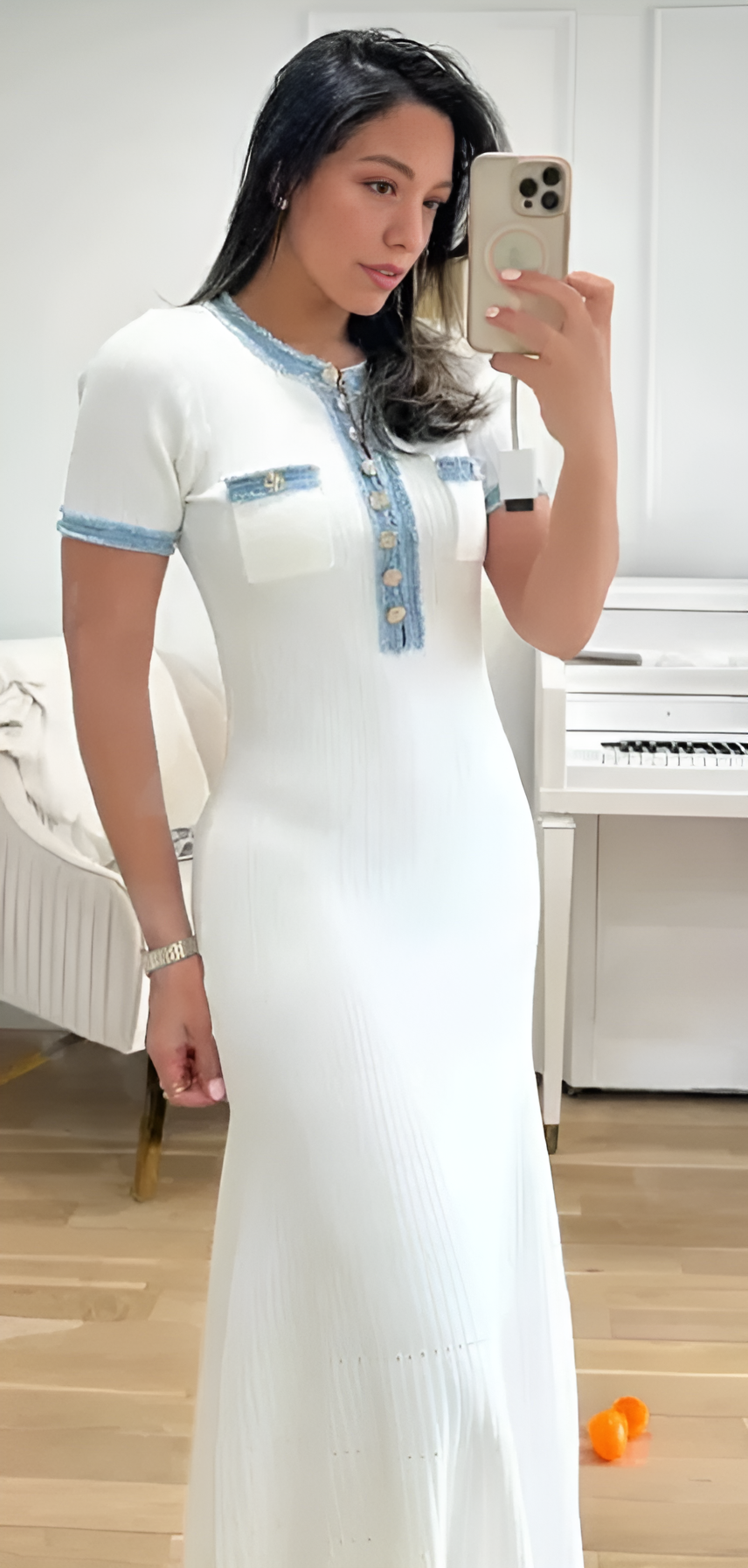 Sukienka Sarah Midi z niebieskimi wykończeniami to ponadczasowy model, który w swobodny sposób łączy elegancję i wygodę. Wykonana z lekkiego, przewiewnego materiału, ta sukienka do kostek zdobiona jest eleganckimi niebieskimi akcentami na śnieżnobiałej bazie – idealna na letnie okazje.
