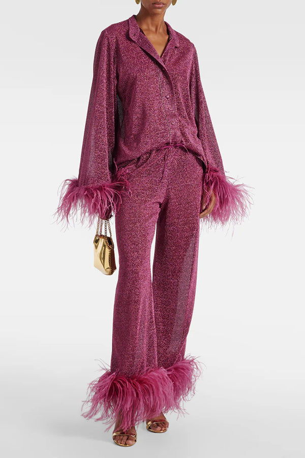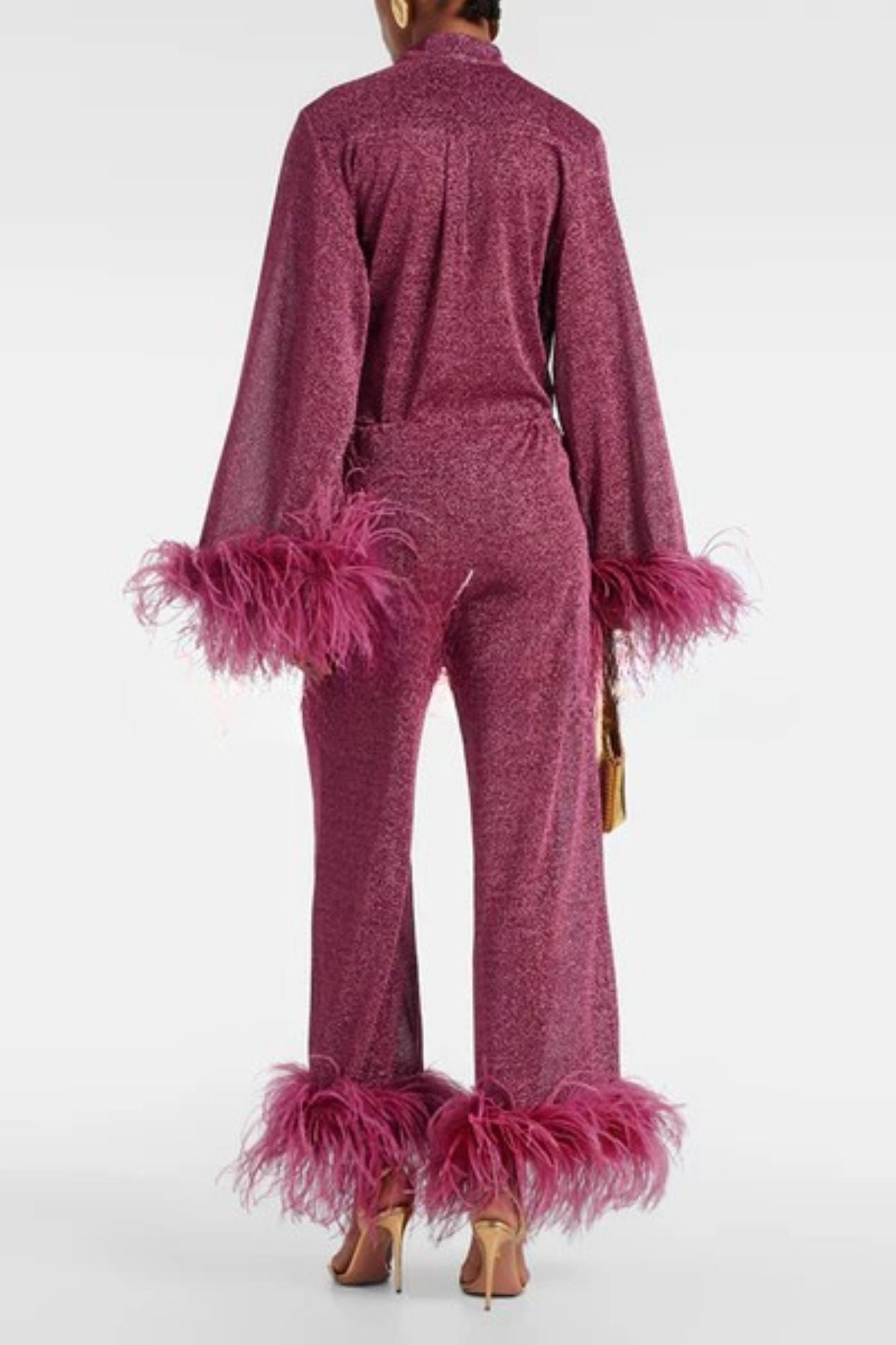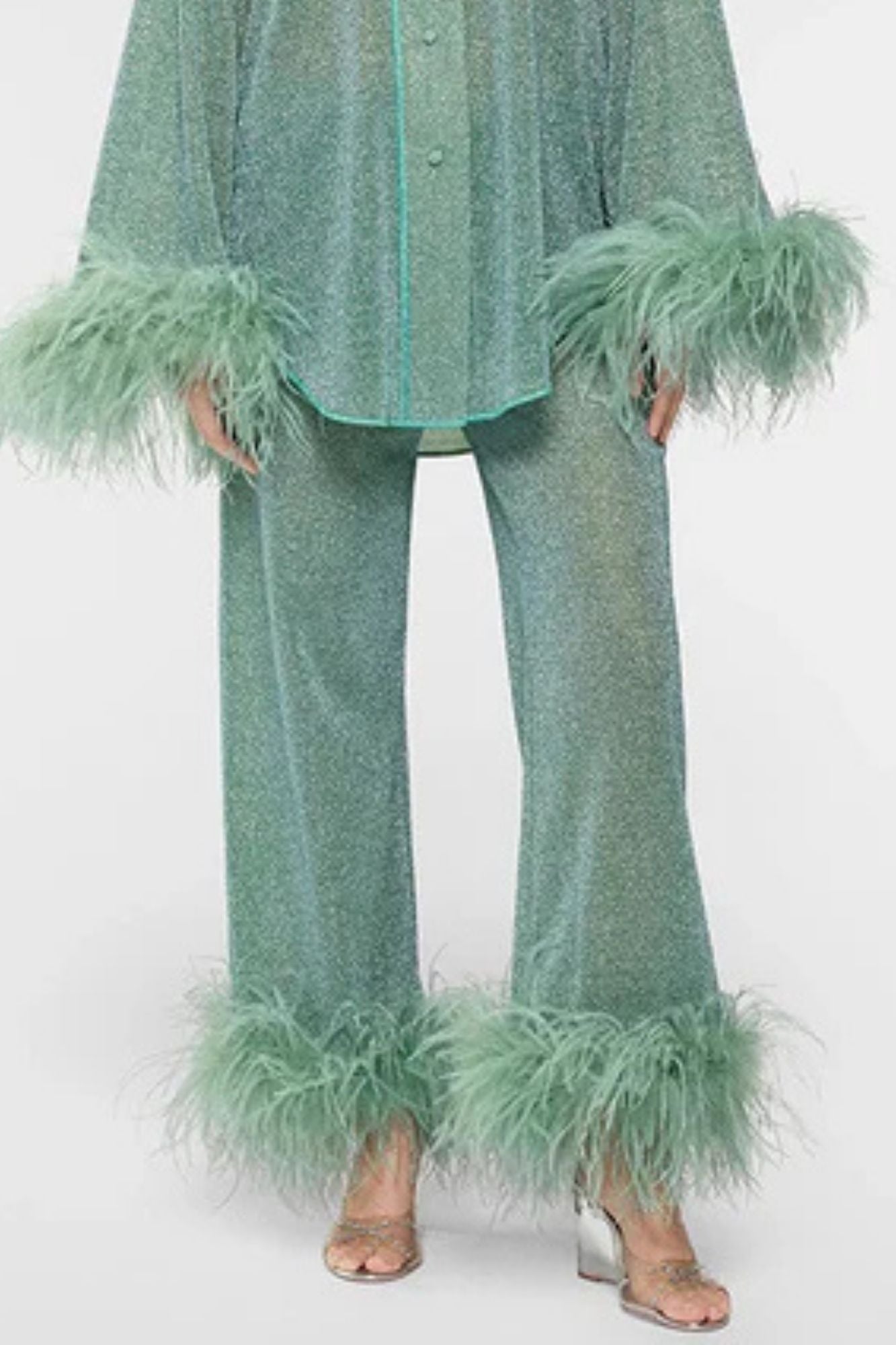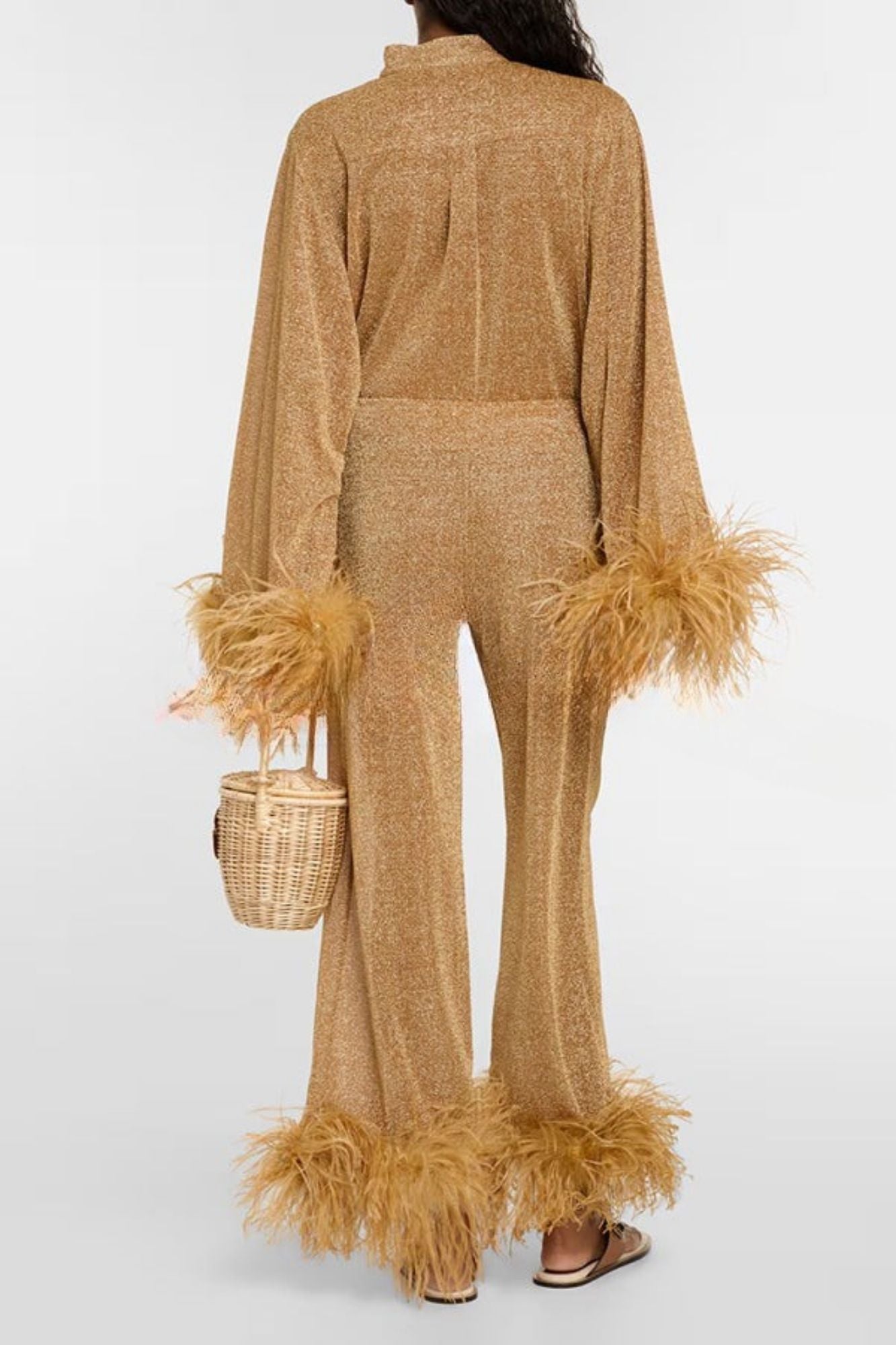 / Zestaw – Brokatowa Bluzka Z Piórami I Proste Spodnie