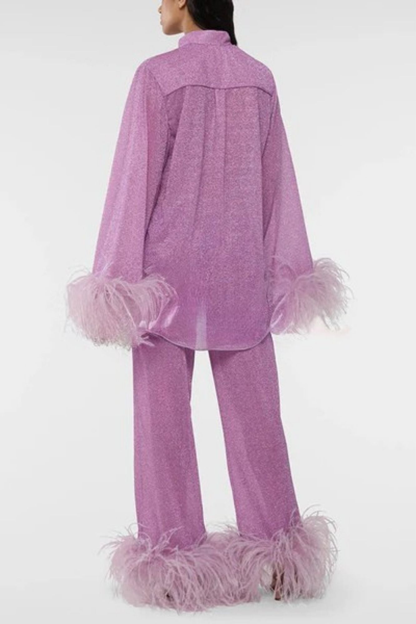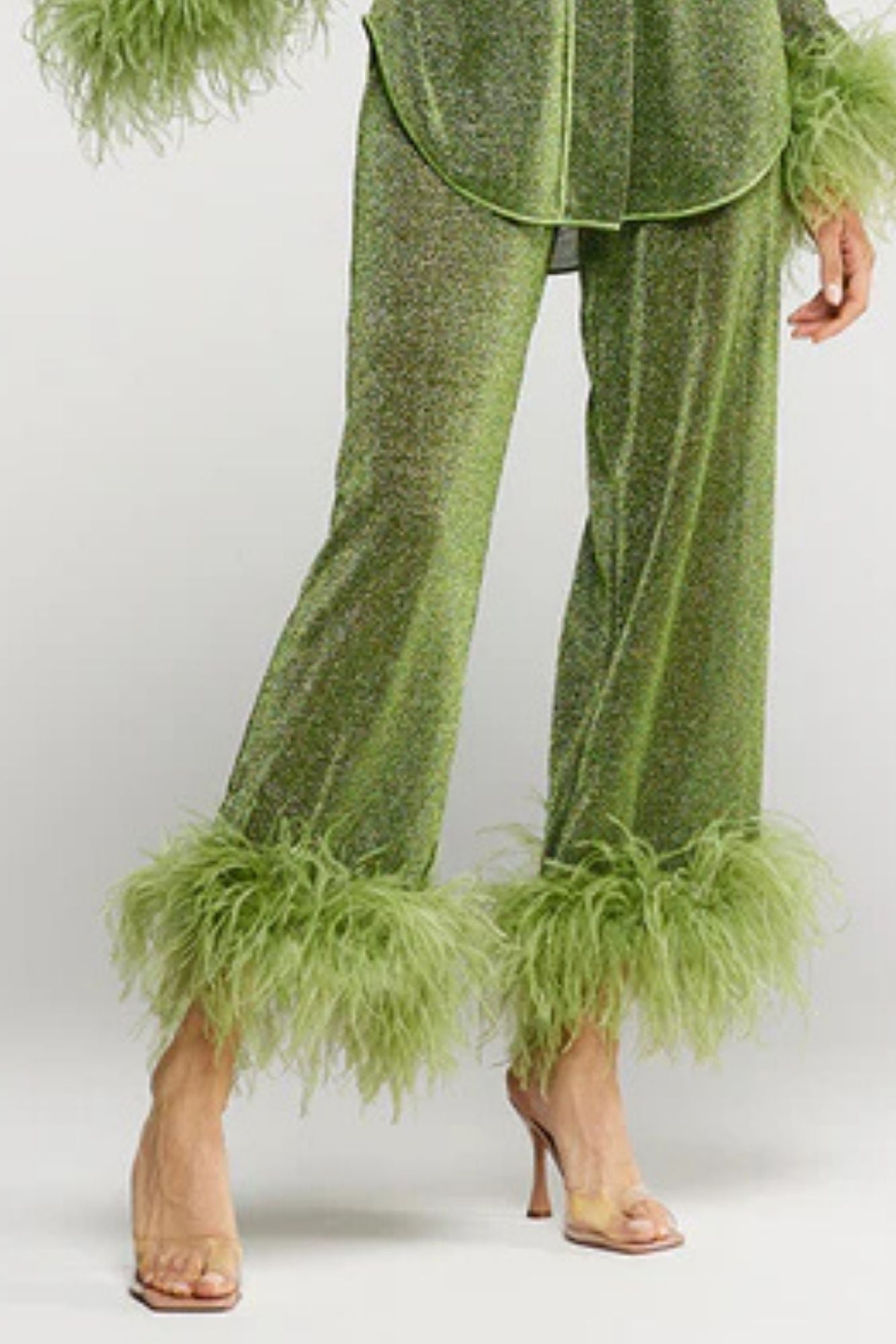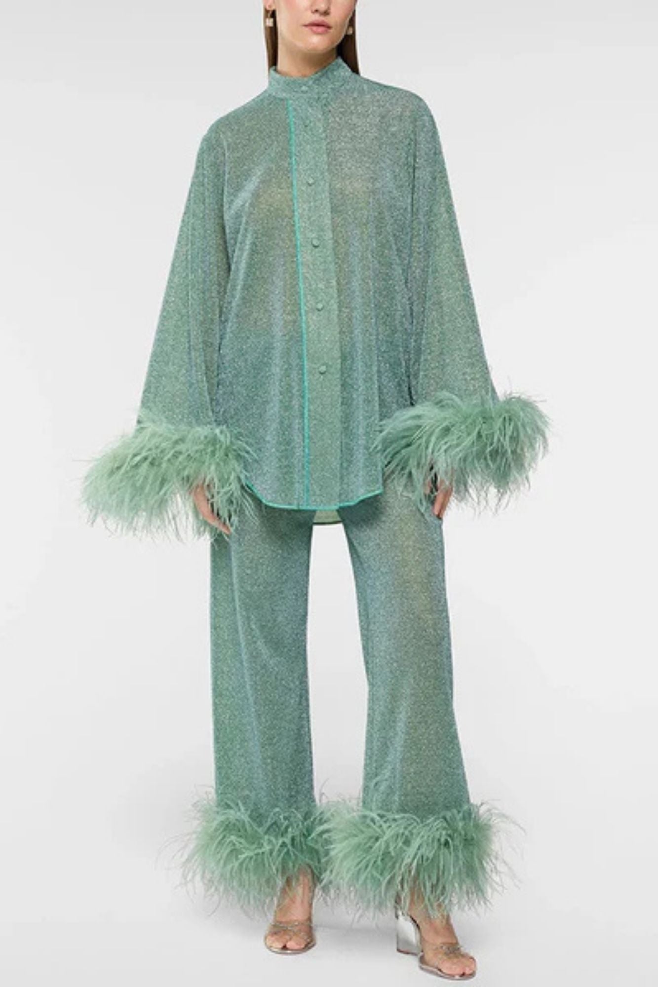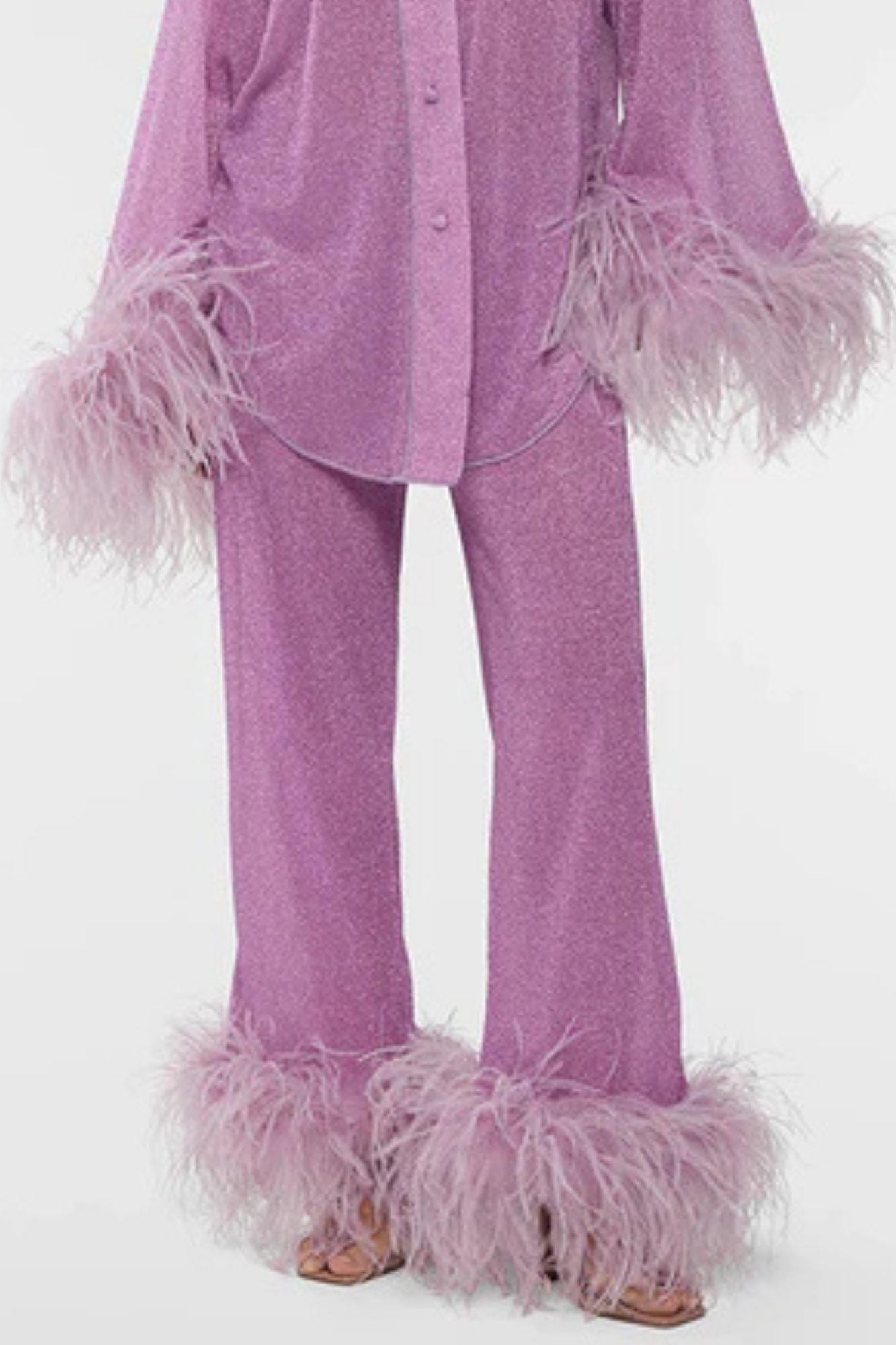 / Zestaw – Brokatowa Bluzka Z Piórami I Proste Spodnie