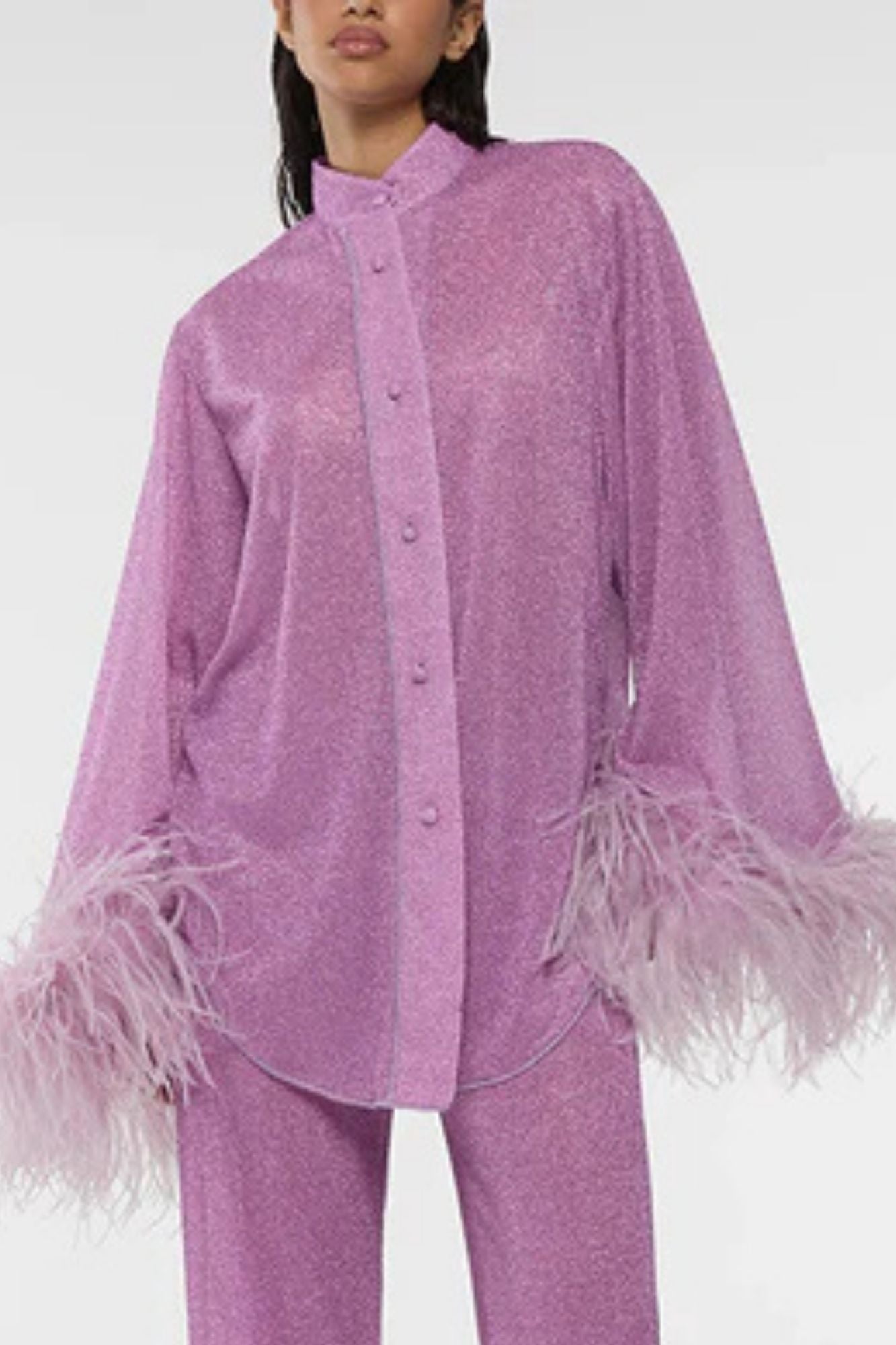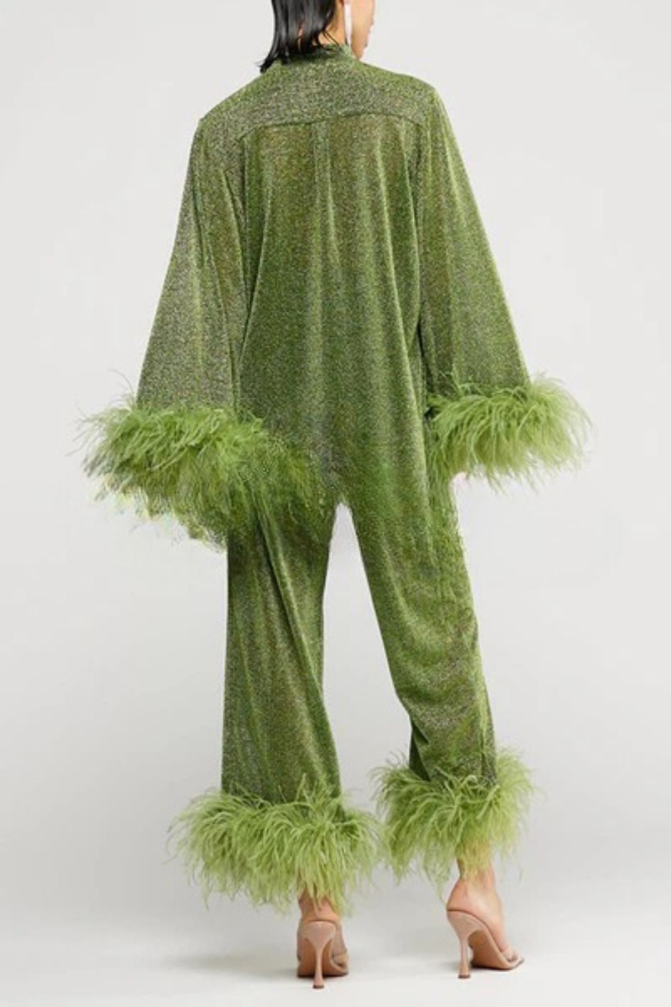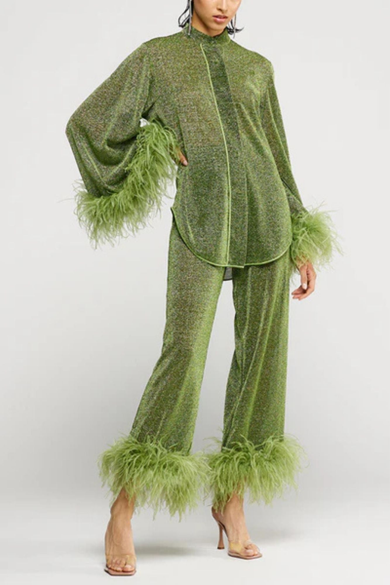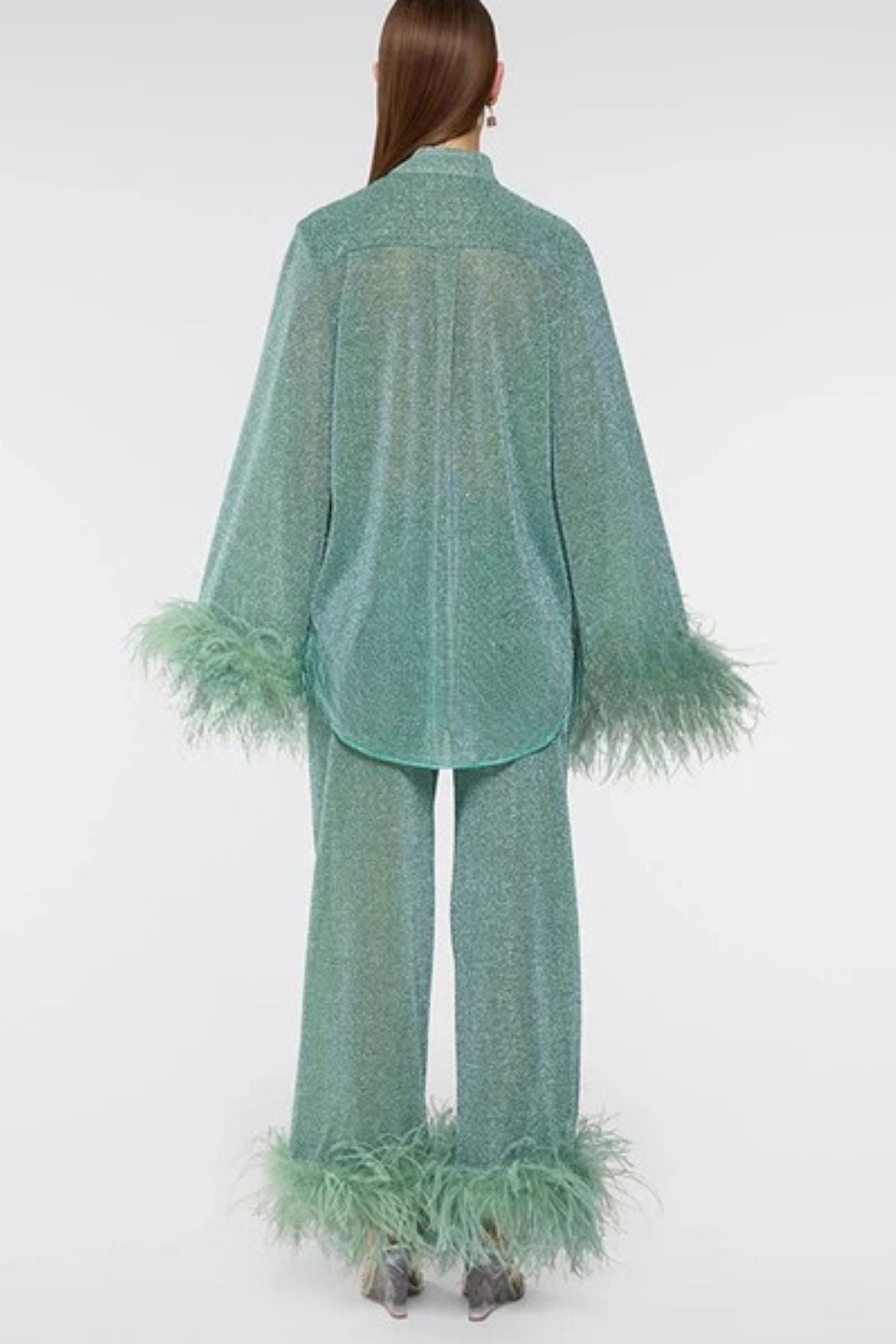 / Zestaw – Brokatowa Bluzka Z Piórami I Proste Spodnie