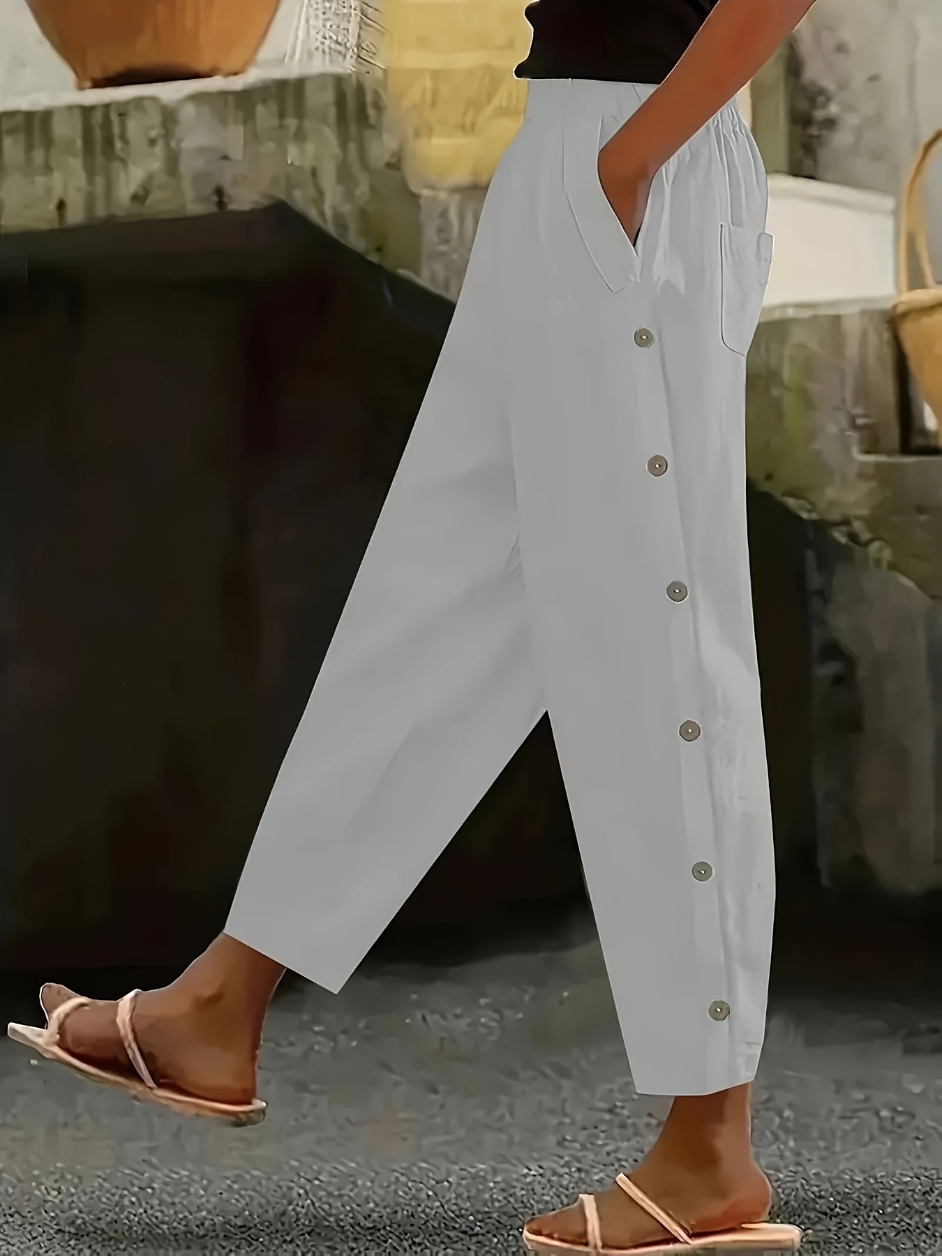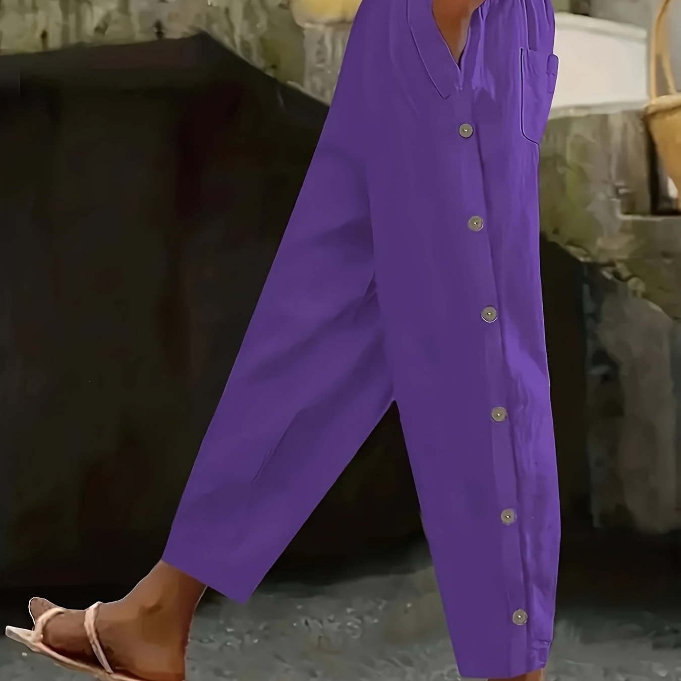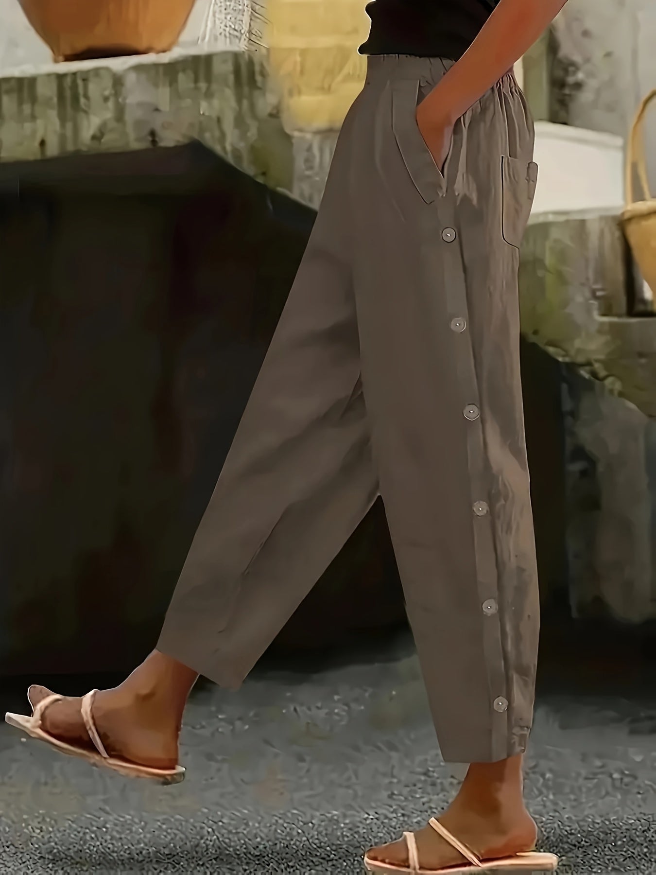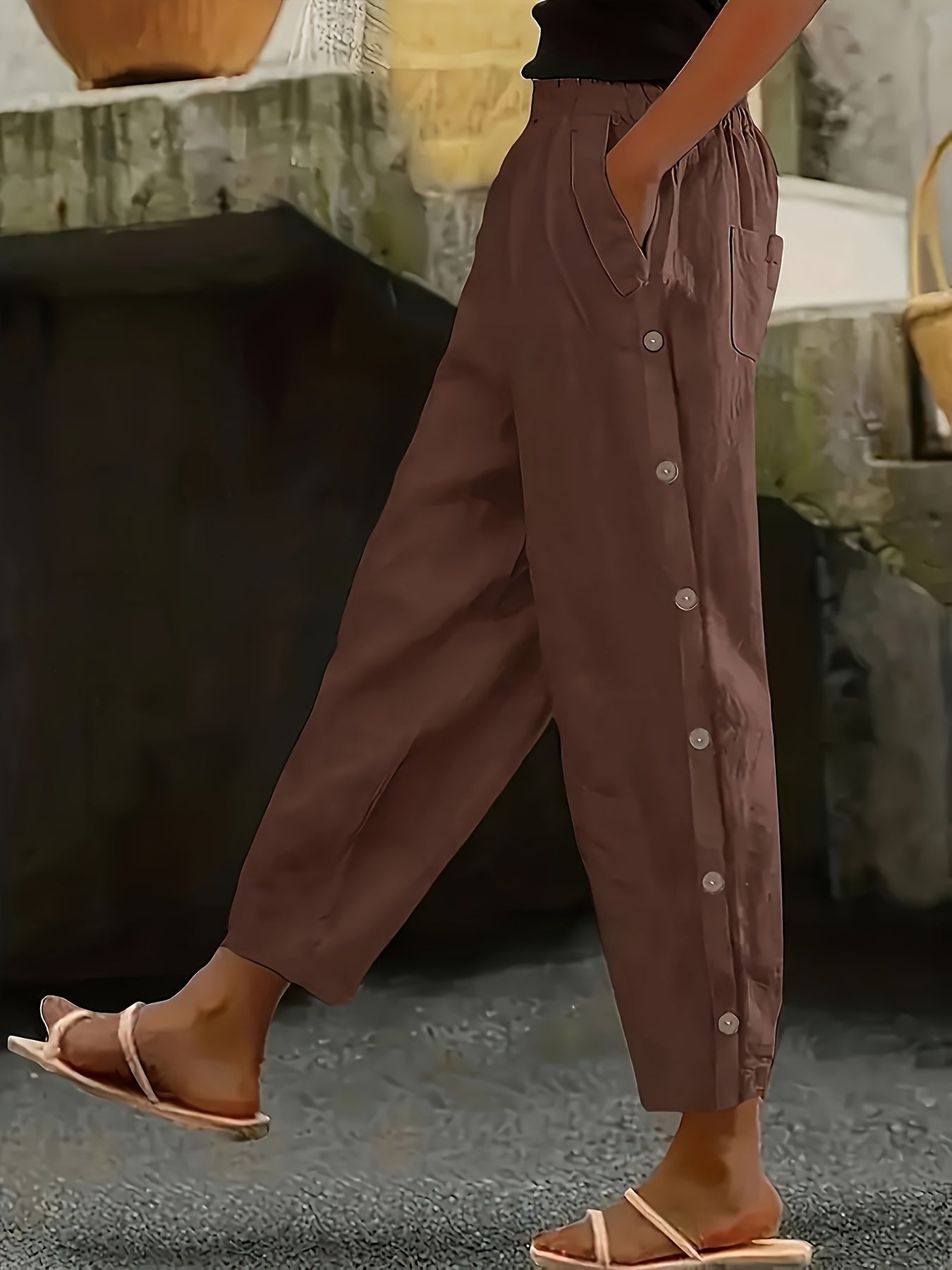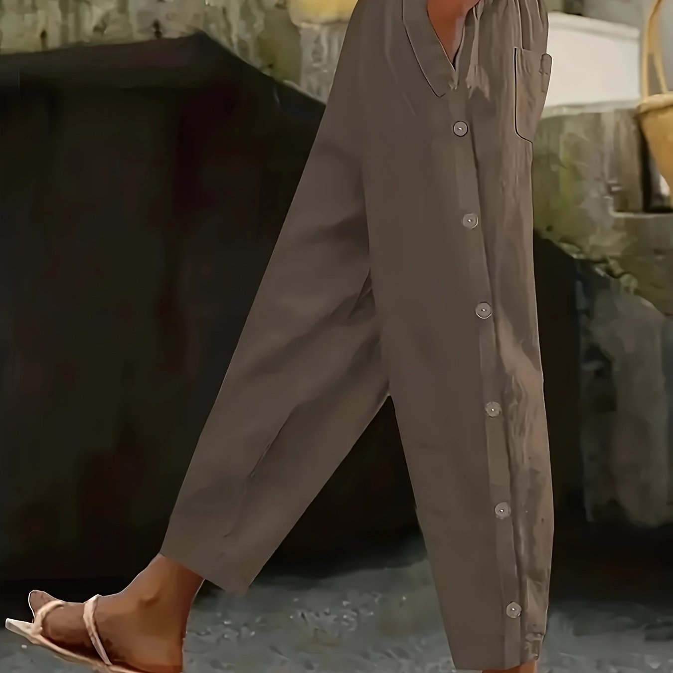 Brunira to brązowe spodnie z szerokimi nogawkami i zapięciem na guziki. Elastyczny pas i kieszenie zwiększają wygodę, a prosty krój dodaje im elegancji. Wykonane z poliestru, nadają się do noszenia przez cały rok. Świetnie pasują do casualowych i półformalnych stylizacji.