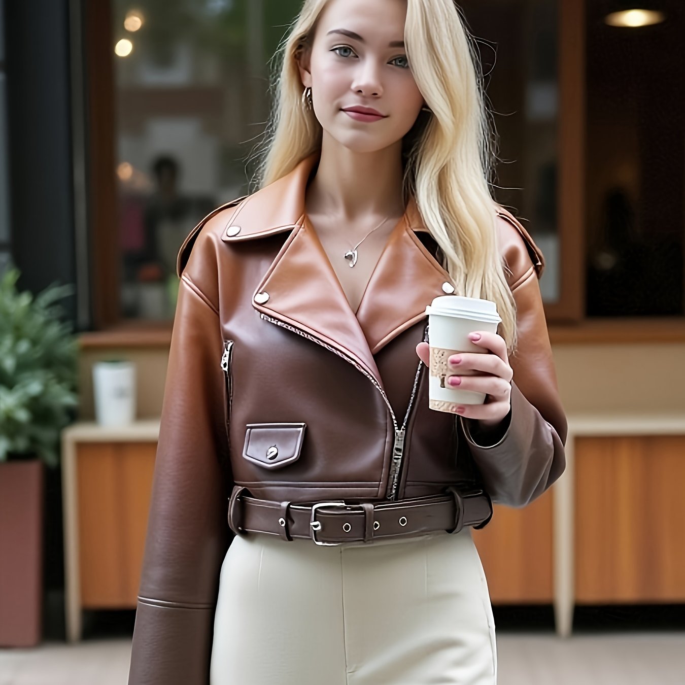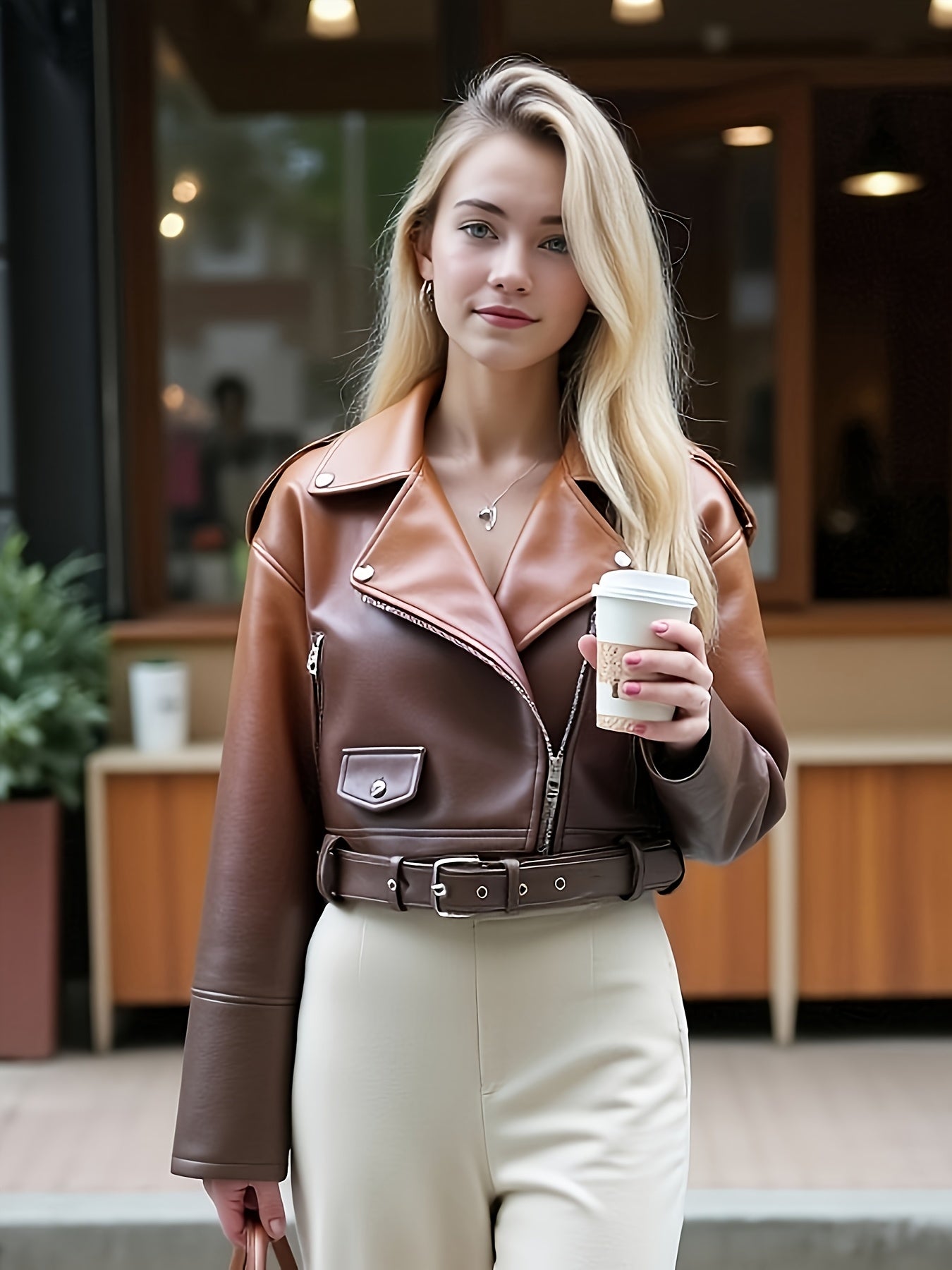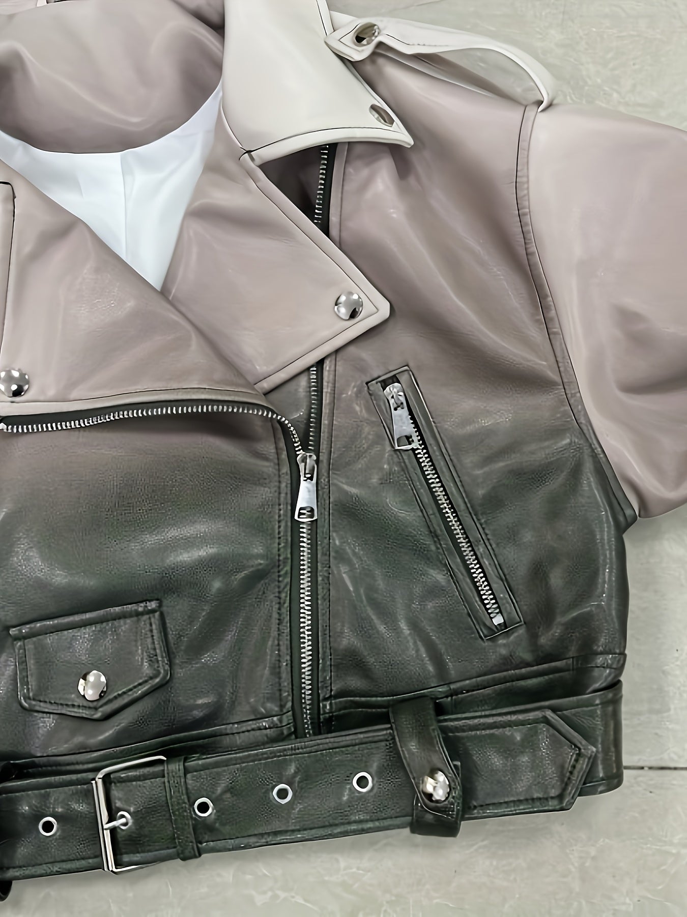 Stylowa kurtka motocyklowa ze skóry PU w gradacyjnym brązie. Asymetryczny dół, kieszenie na zamek i detale pasa tworzą nowoczesny, uliczny styl. Idealna na co dzień i wieczorne wyjścia wiosną oraz jesienią.
