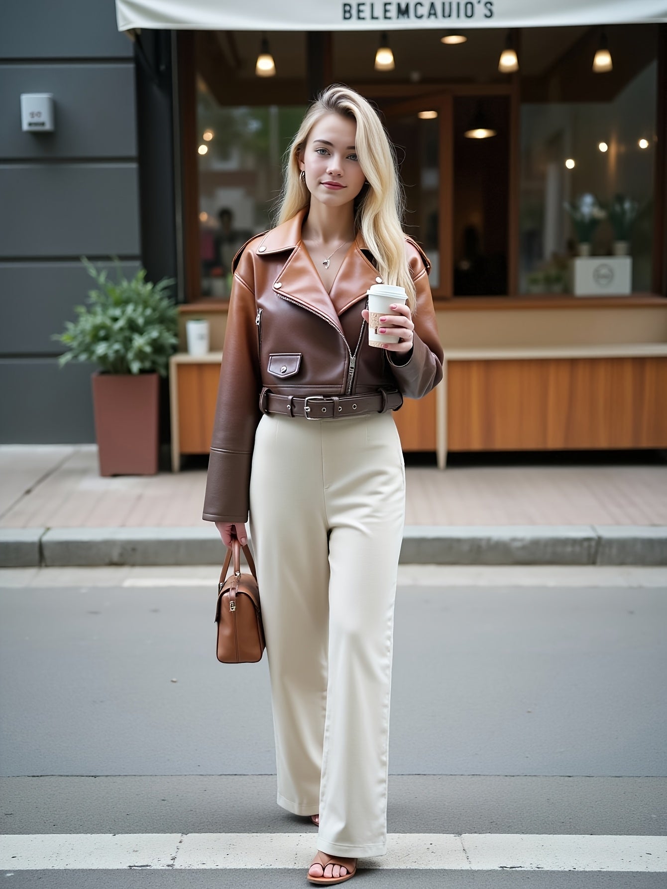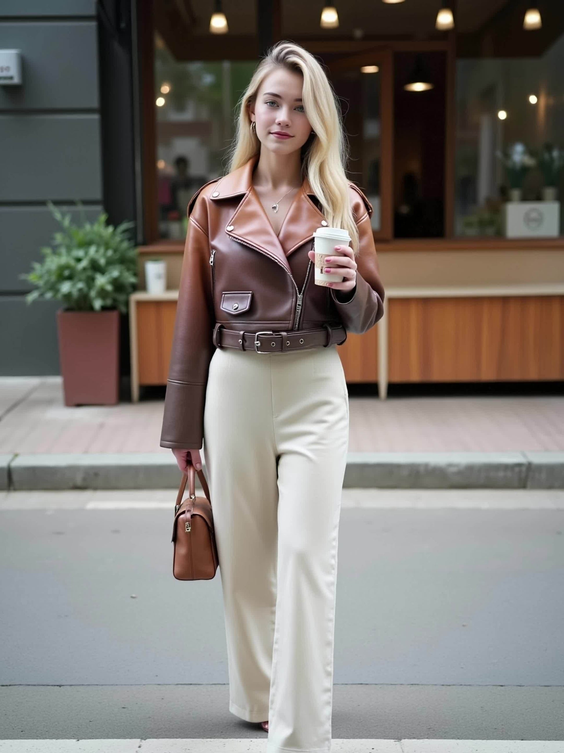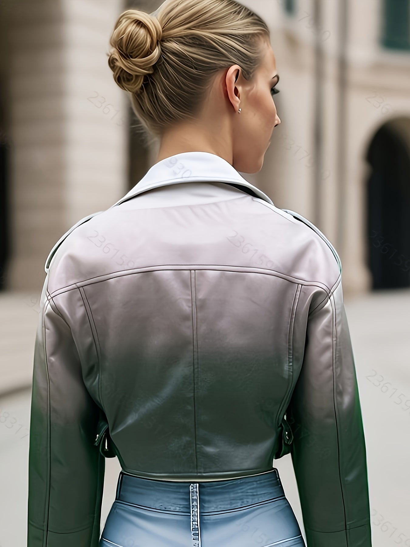 Stylowa kurtka motocyklowa ze skóry PU w gradacyjnym brązie. Asymetryczny dół, kieszenie na zamek i detale pasa tworzą nowoczesny, uliczny styl. Idealna na co dzień i wieczorne wyjścia wiosną oraz jesienią.