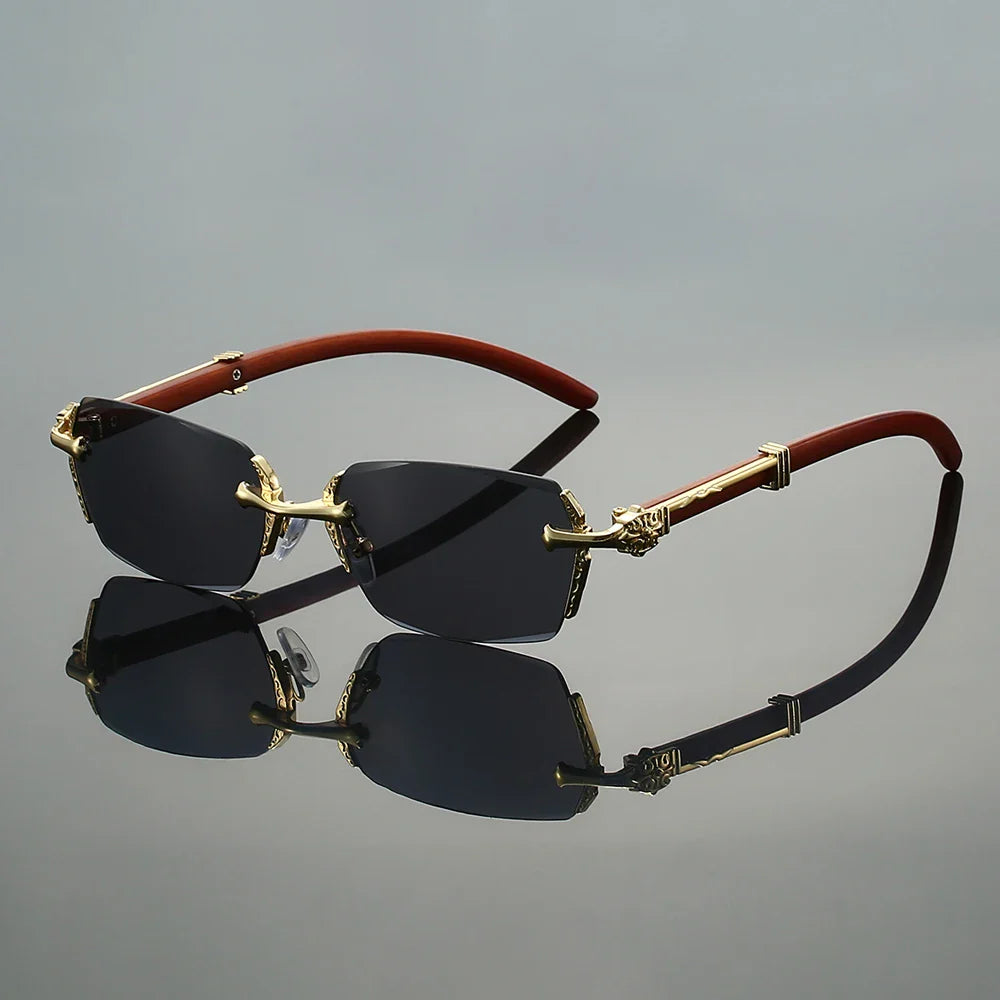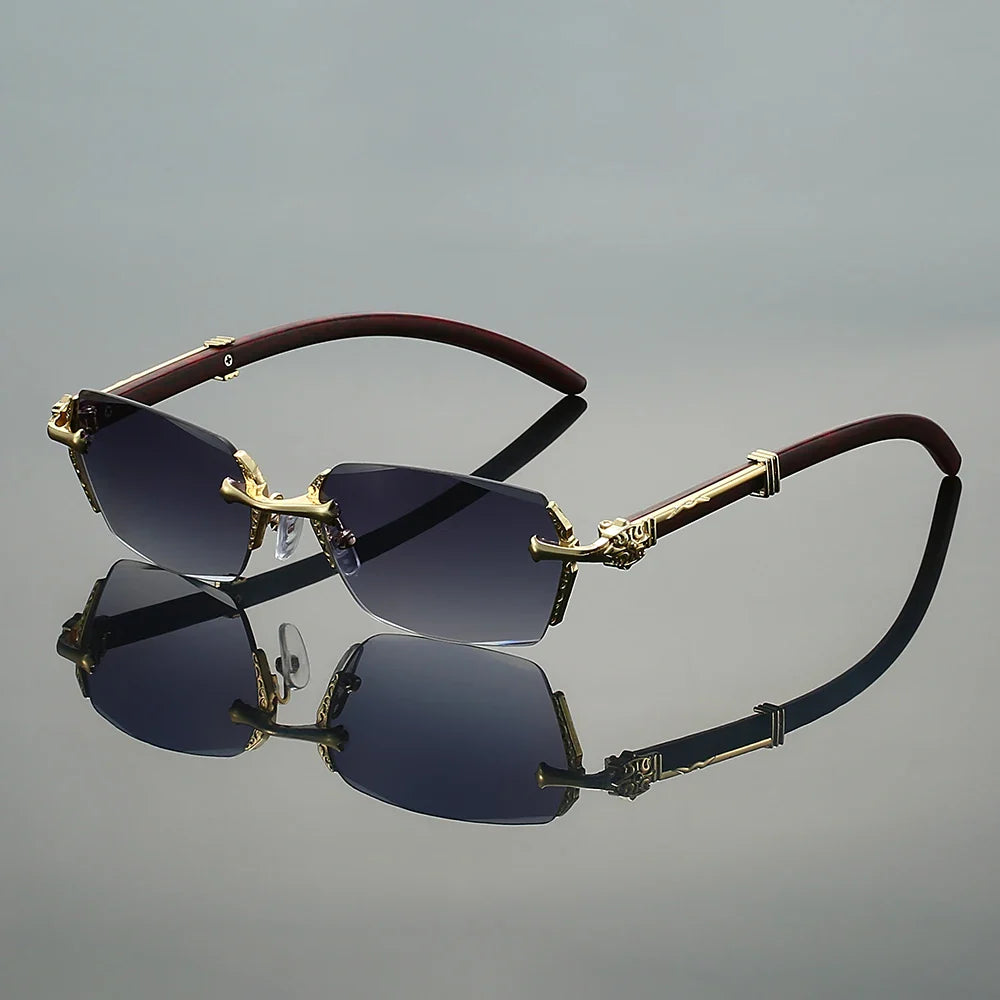 Bezramkowe prostokątne soczewki łączą się poprzez rzeźbione złote akcenty, które oplatają mostek i zawiasy z ozdobną precyzją. Teksturowane zauszniki elegancko zakrzywiają się wokół uszu, uzupełnione rzeźbionymi detalami na bokach. Wykończone gładkim wnętrzem, które nadaje sylwetce ostrości i wyrafinowania.