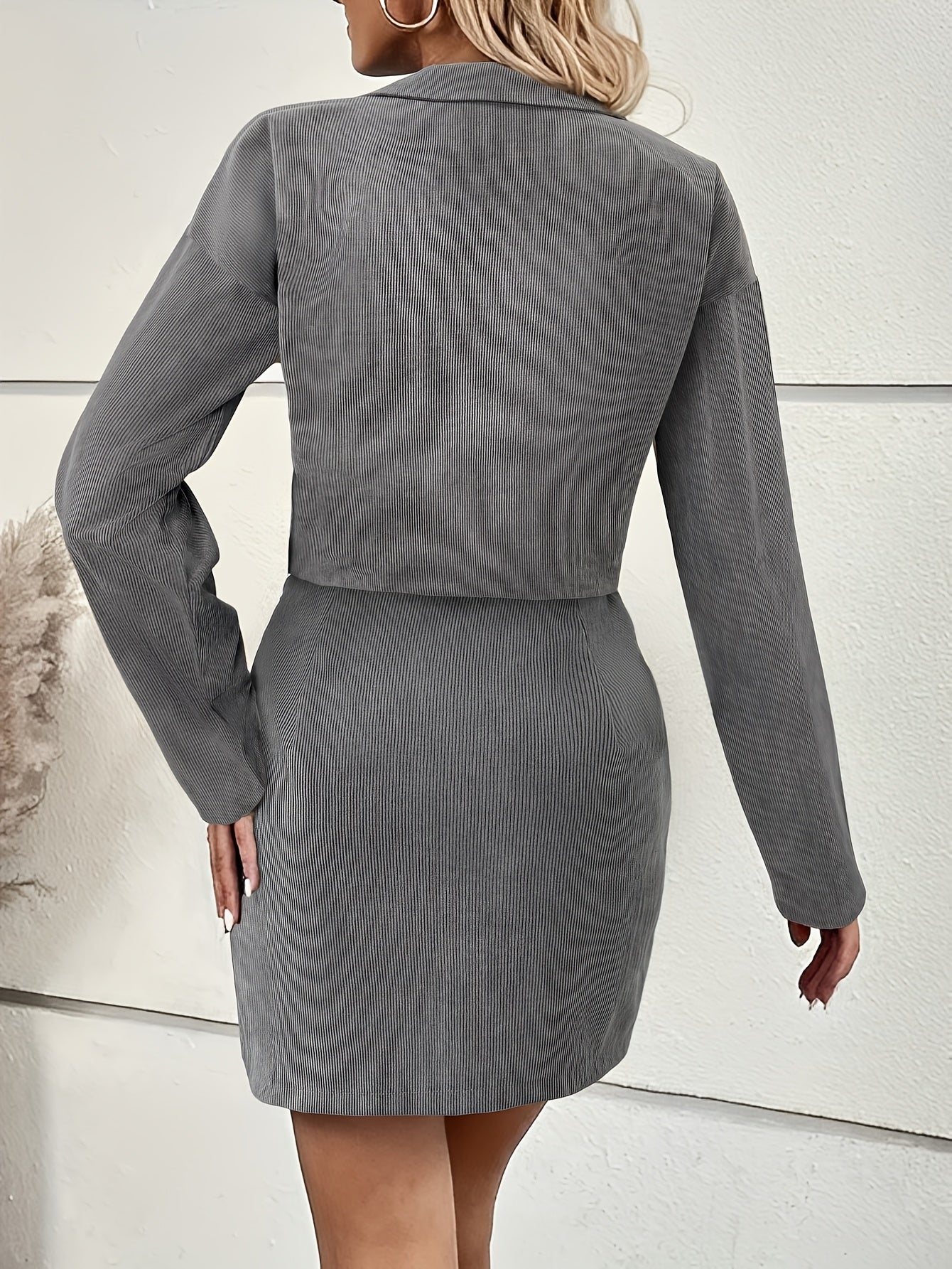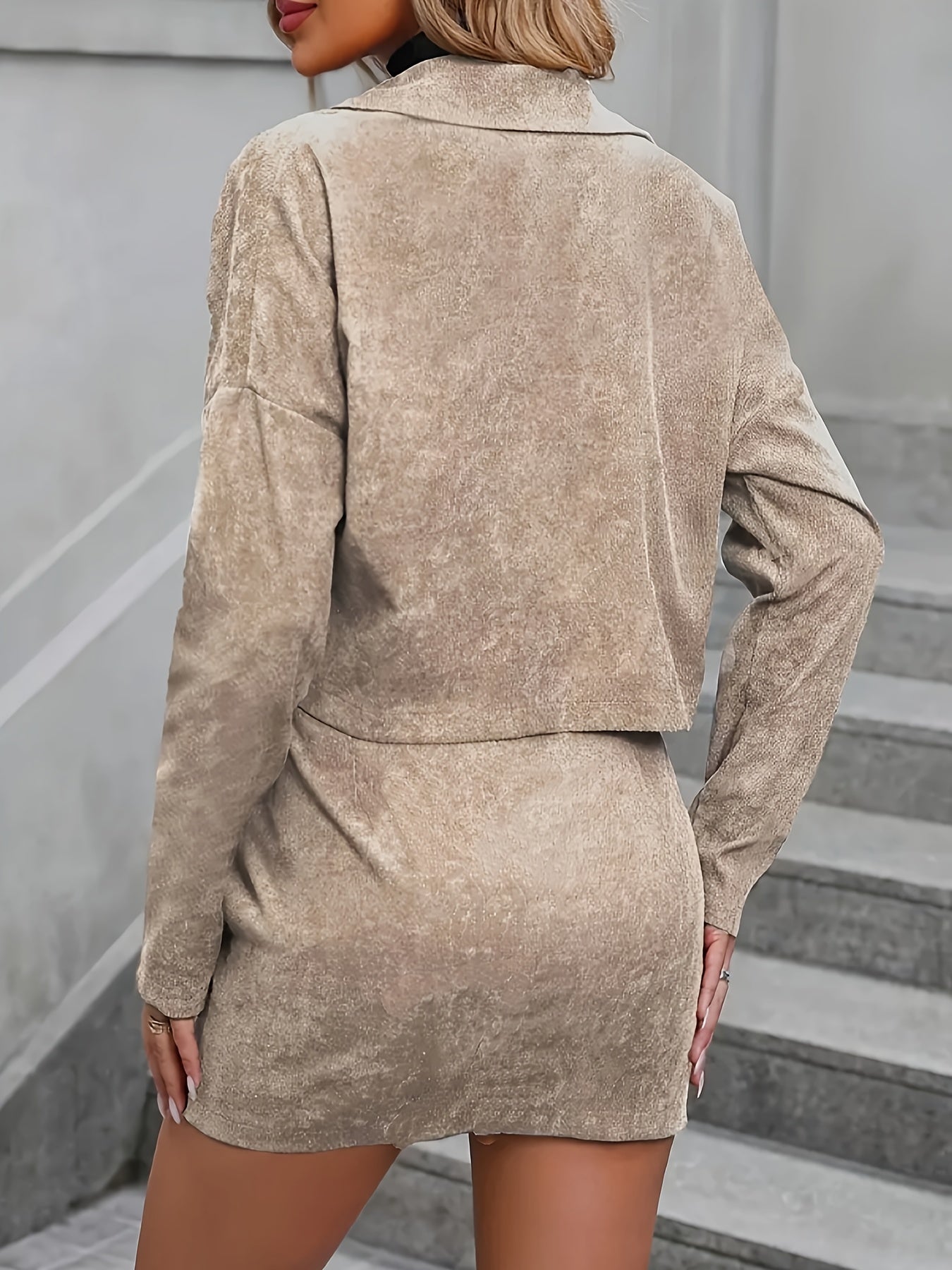 Zestaw Teresa to elegancki komplet z kołnierzykiem polo i spódnicą w jednolitym kolorze. Miękka aksamitna tkanina nadaje mu wyrafinowanego charakteru, idealnego na sezon jesień-zima.