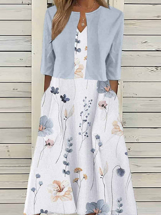 / Wygodna dwuczęściowa sukienka midi z krótkim rękawem i kwiatowym nadrukiem