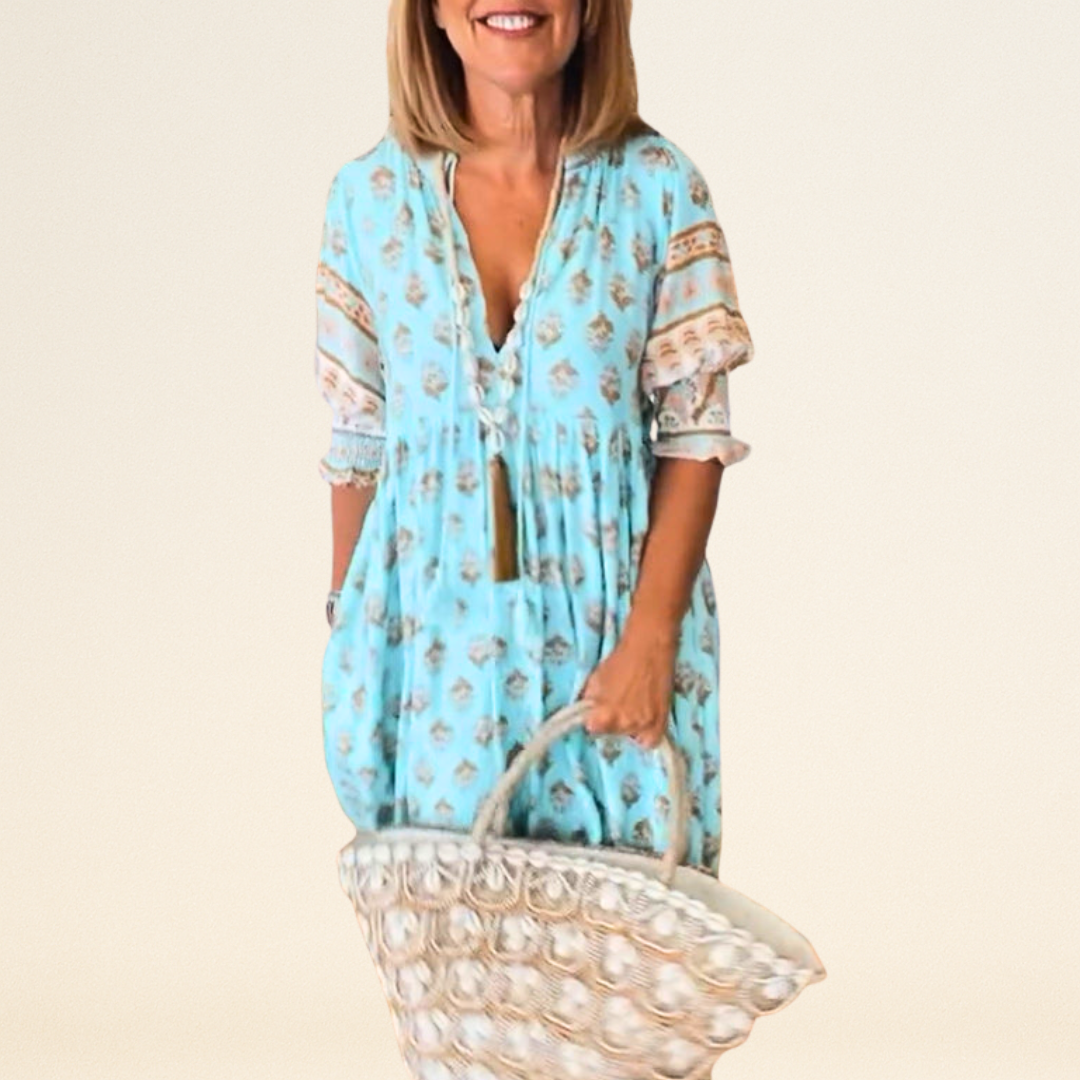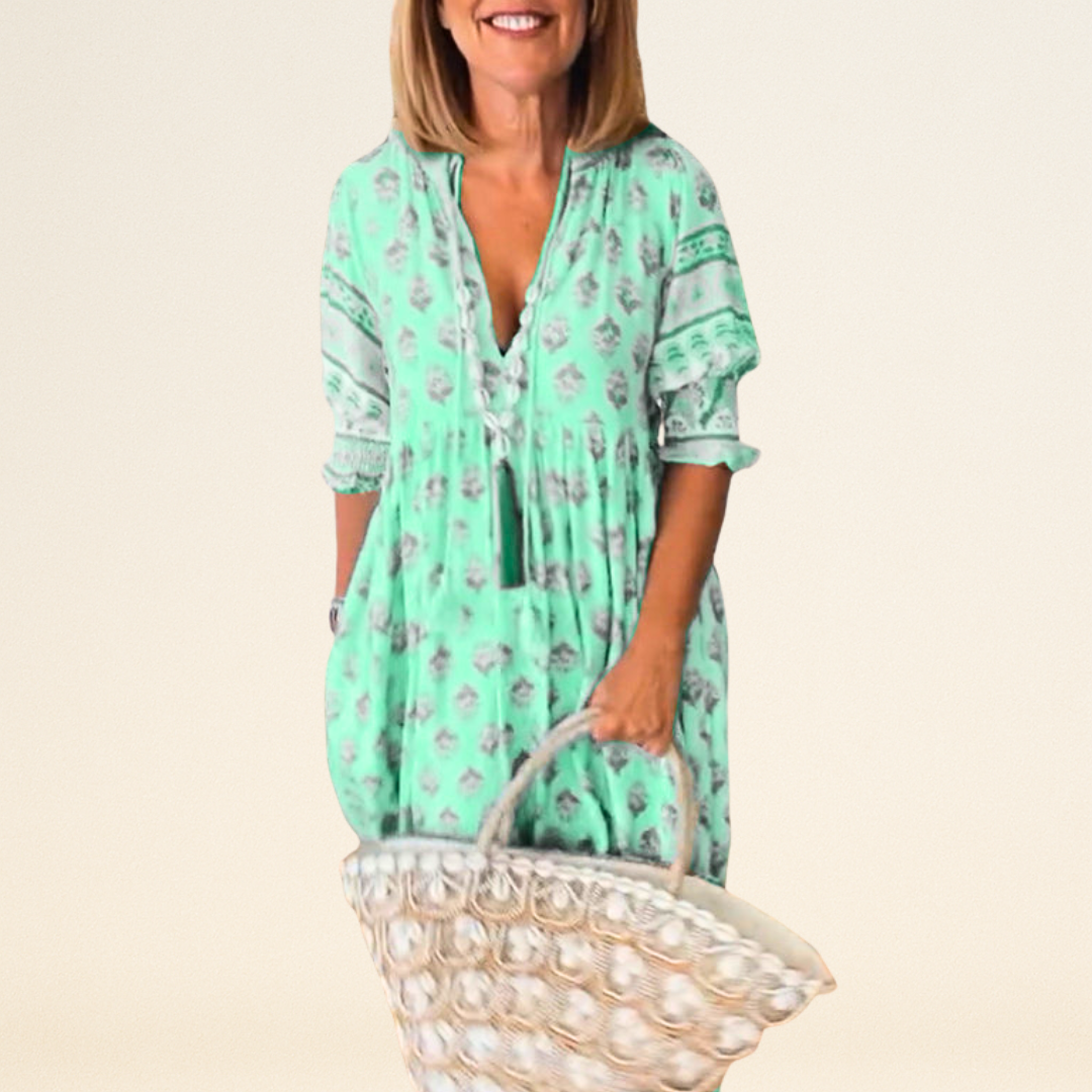 Przeżyj lato w sukience Vina – idealnej towarzyszce słonecznych spacerów, brunchów na plaży czy relaksujących wypadów na targ. Jej swobodna elegancja i ręcznie wykonany wzór dodadzą odrobinę wakacyjnego luksusu, gdziekolwiek się udasz.
