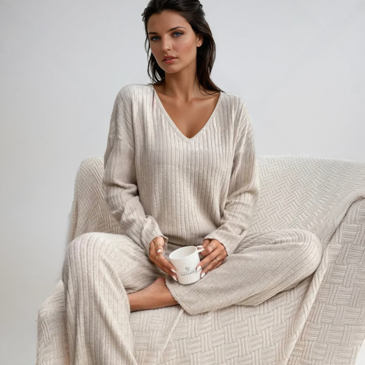 Maksymalny styl i komfort. Sophie łączy elegancki design z najwyższym komfortem. Ten dwuczęściowy, prążkowany komplet wykonany jest z miękkiego i wygodnego poliestru oraz nylonu, który jest przyjemny dla skóry. Dzięki luźnemu krojowi Sophie sprawdzi się zarówno w przytulnych domowych stylizacjach, jak i jako szykowny dodatek na co dzień. Komplet składa się ze swetra z eleganckim dekoltem w serek oraz spodni o miękkim i wygodnym kroju.