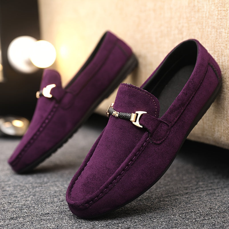 Wsuwane mokasyny z gumową podeszwą i stylowym metalicznym zapięciem. Łączą elegancję z wygodą, idealne zarówno na co dzień, jak i na specjalne okazje. Trwała konstrukcja zapewnia komfort i długowieczność.