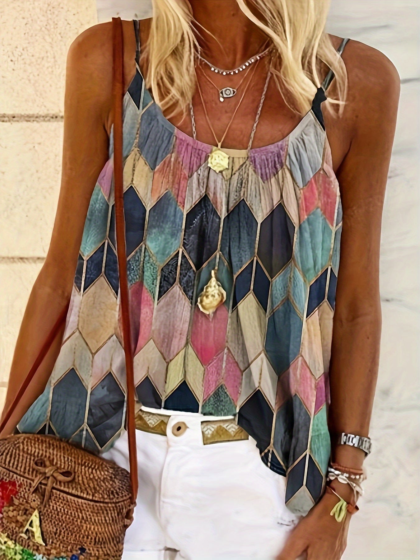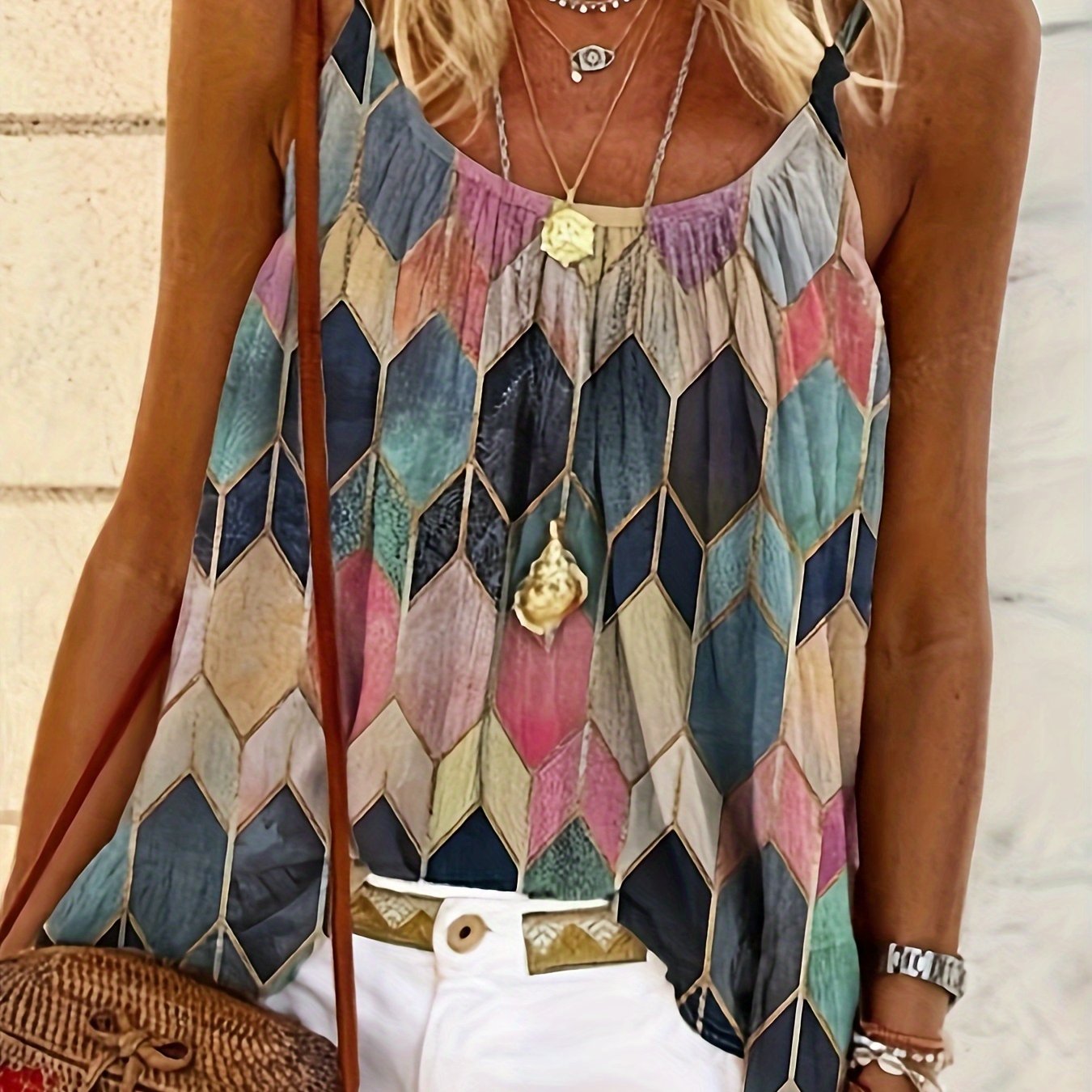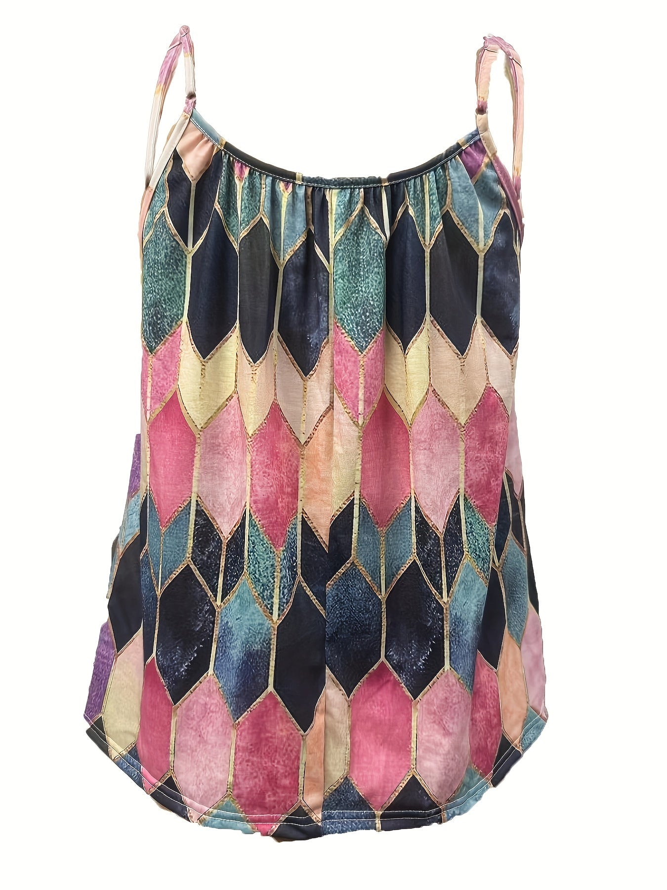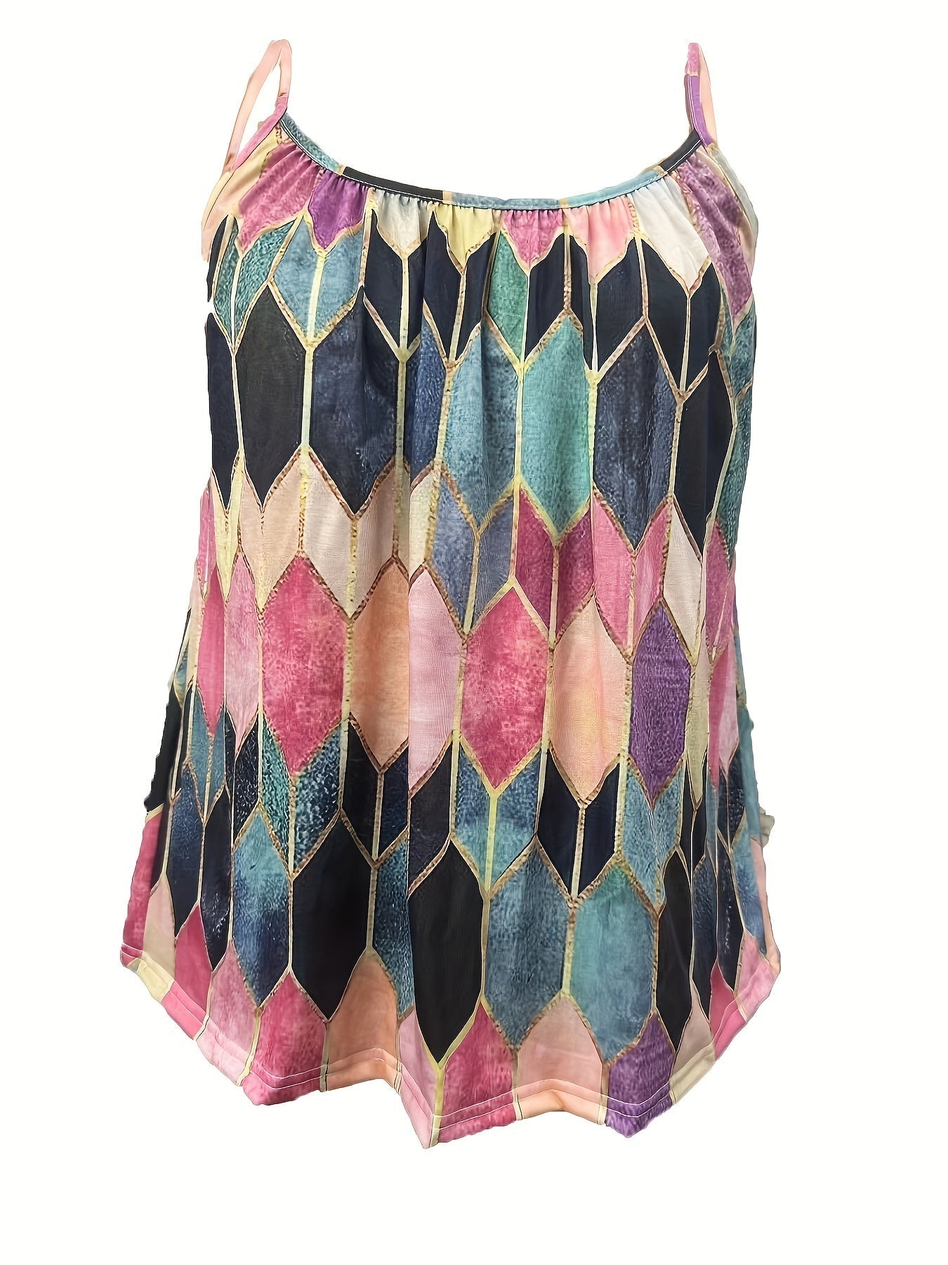 Bezrękawnik Zofia to elegancka propozycja z marszczonym biustem i kolorowym geometrycznym wzorem. Luźny krój i mikroelastyczność sprawiają, że jest wygodny i stylowy na lato.